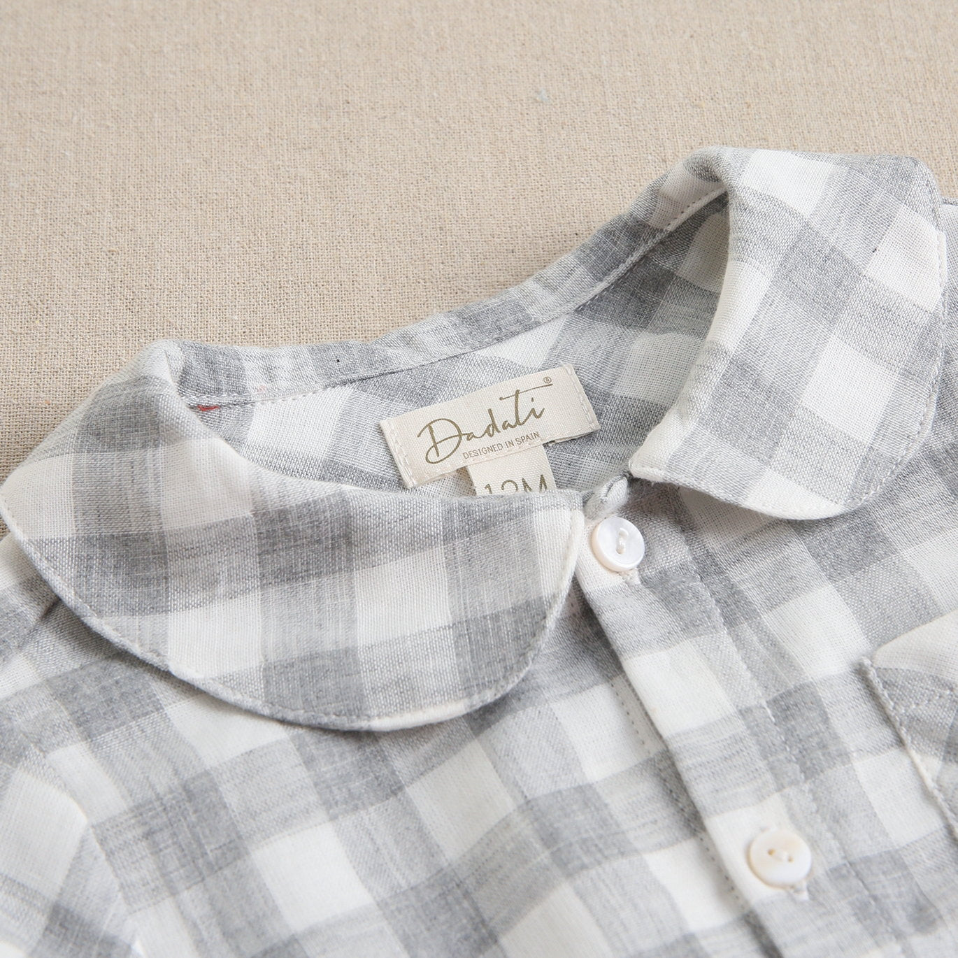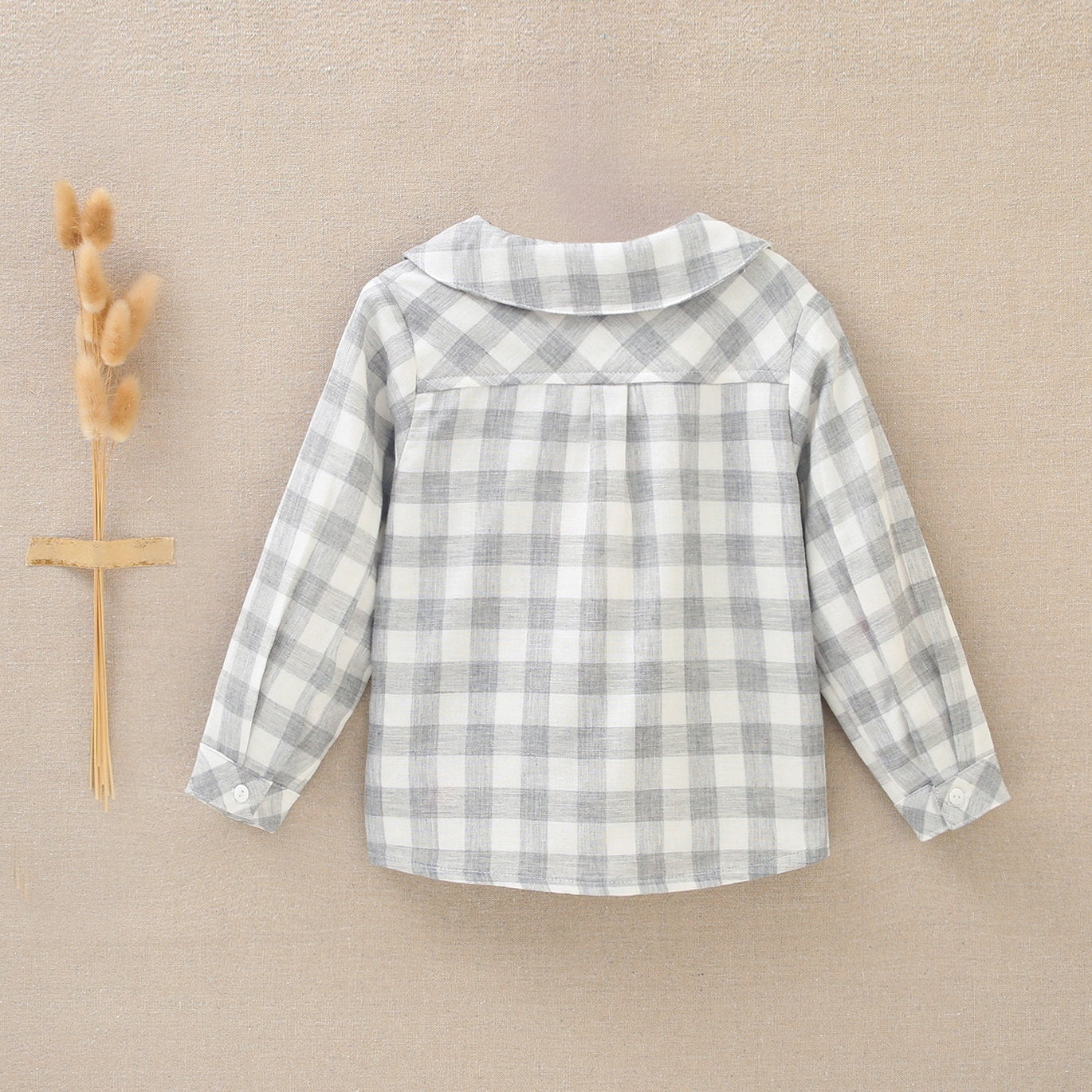 Camisa bebé estampado cuadros grises y blancos. Con cuello bebé y bolsillo delantero, manga larga, tapeta de botones en parte delantera.