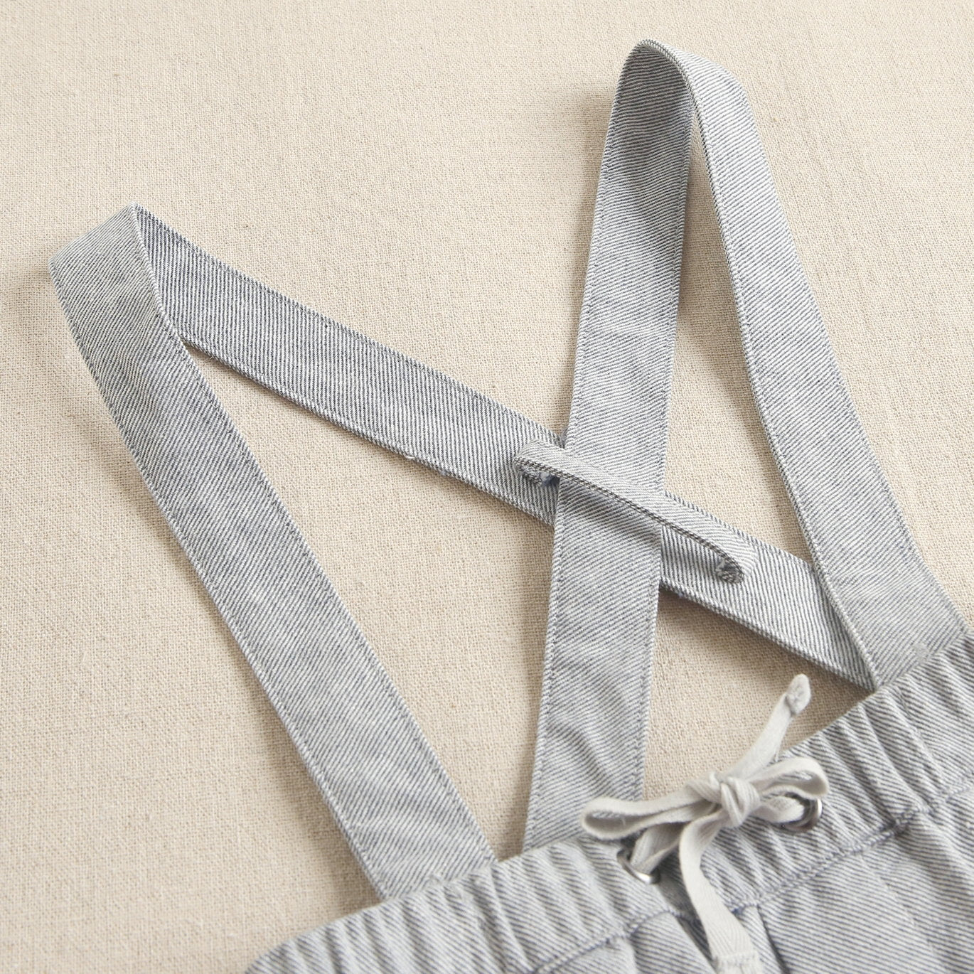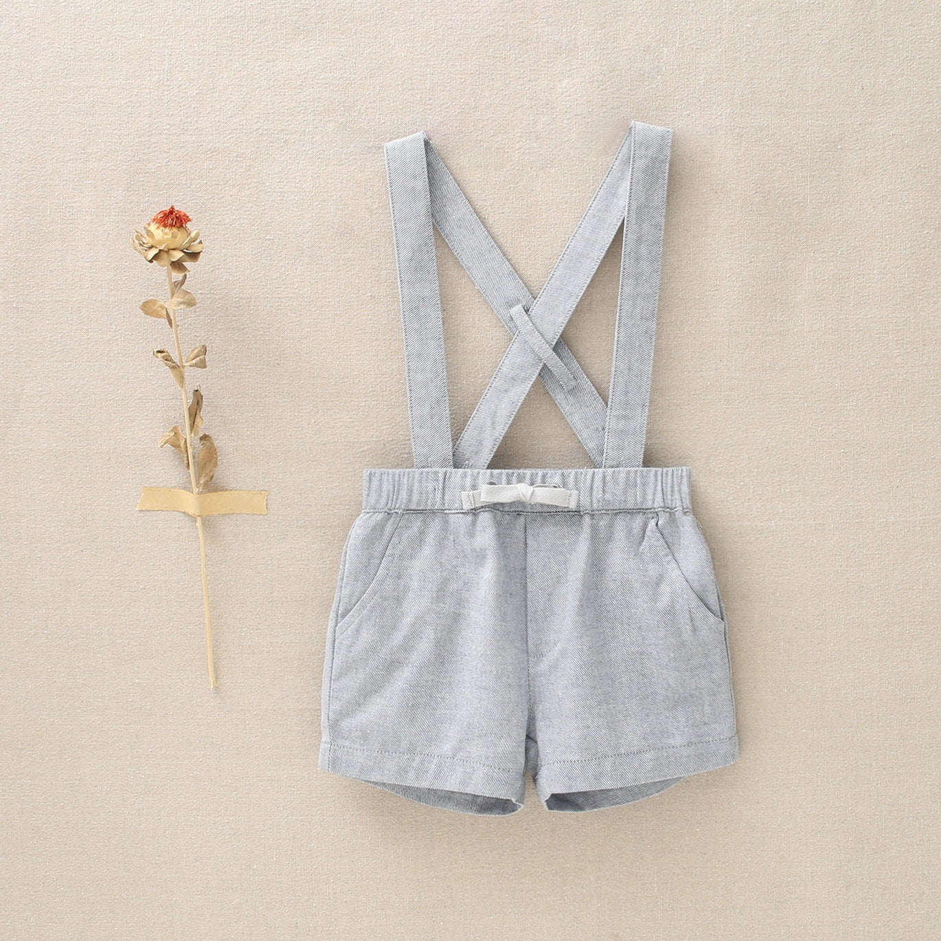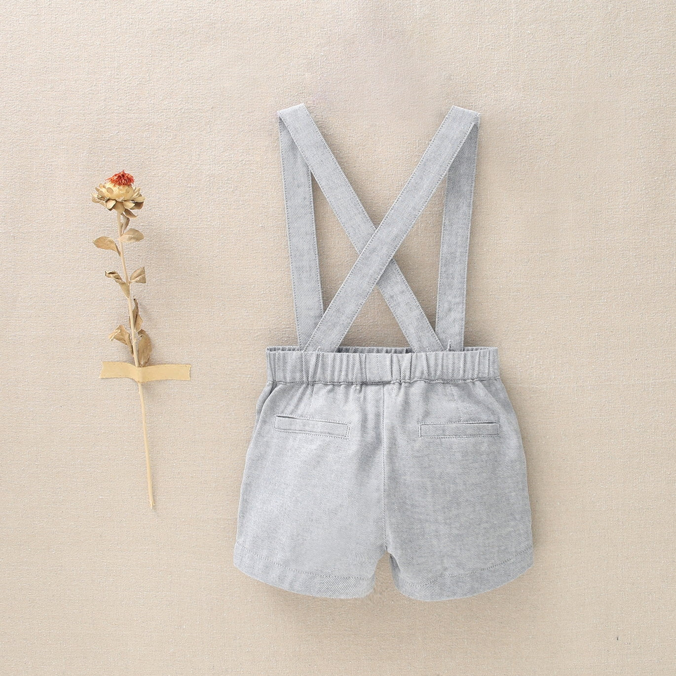 Short bebé en tono gris, con tirantes extraíbles y cruzados en espalda. Bolsillos delanteros y cinta en contraste en cintura.