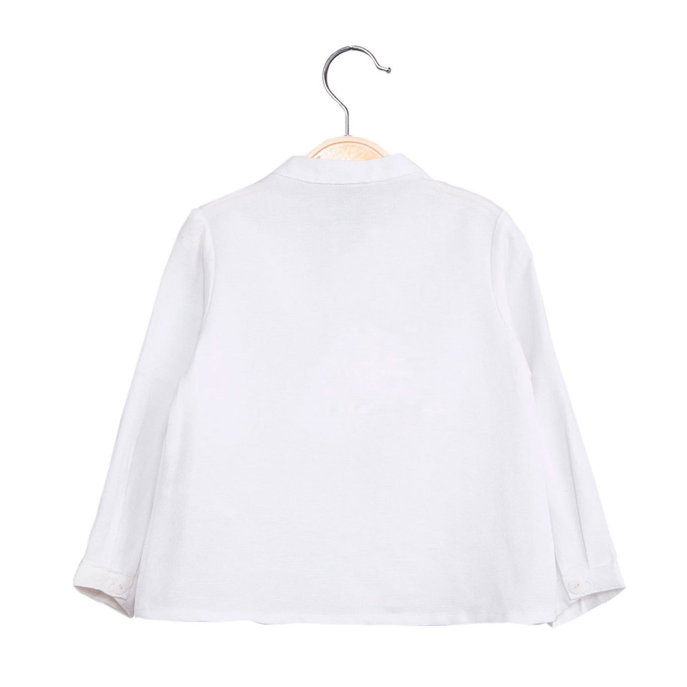 Camisa bebé blanco con detalle bordado en rosa. Cuello mao y cierre mediante abotonadura completa central. Manga larga.