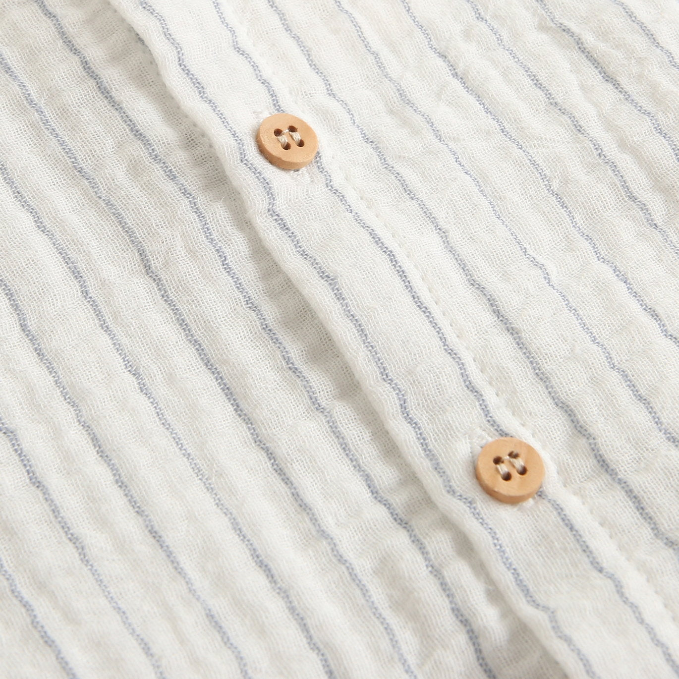 Camisa bebé blanca con rayas azules. Cuello bebé y manga larga, cierre mediante tapeta de botones de madera.