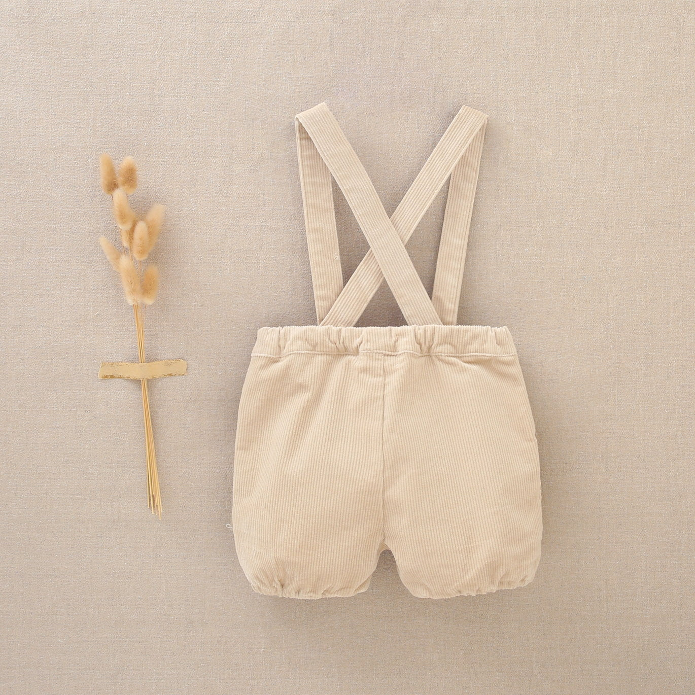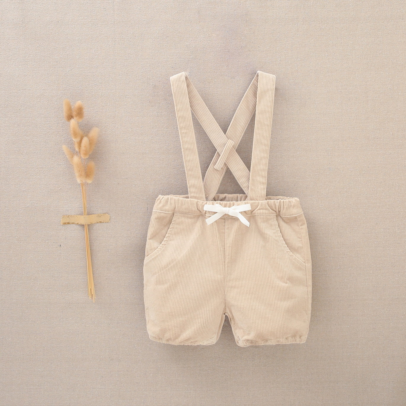 Peto bebé niño pana beige con tirantes cruzados en espalda, cinturilla elástica con cintilla en color en contraste. Bolsillo delanteros