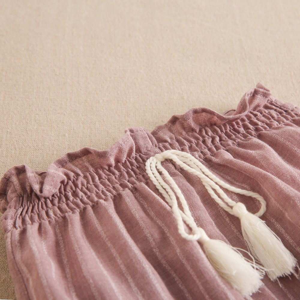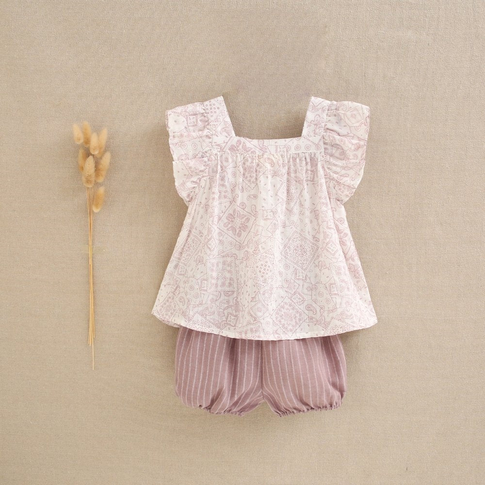 Conjunto para bebé niña; blusa blanca con estampado rosa, manga tirante ancho con volante y botones de madera en parte delantera, pololo empolvado rosa rayas blancas con cordón en cintura y resorte en piernas.
