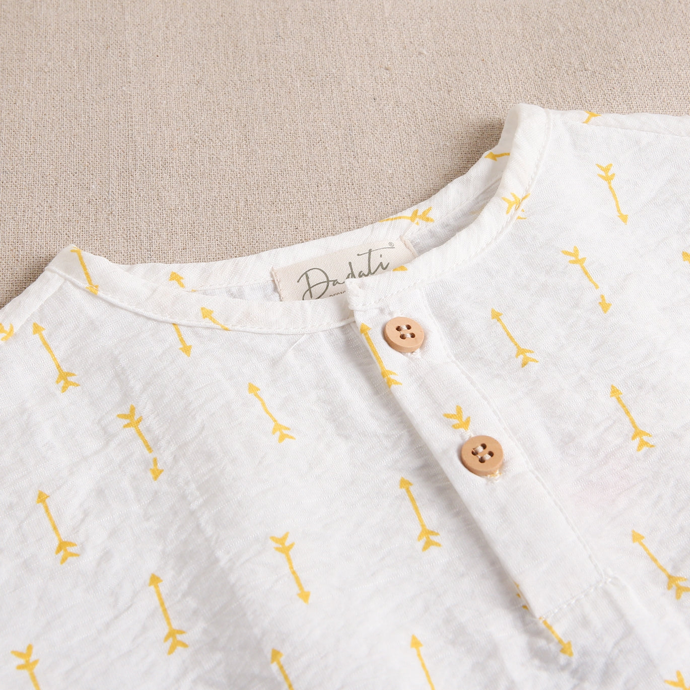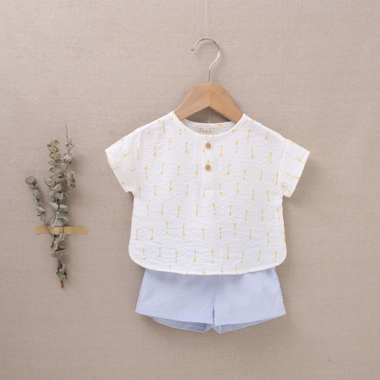 Conjunto bebé niño, camisa manga corta blanca estampado flechas amarillas, cierre mediante dos botones en la parte delantera. Short resorte en cintura rayas azules y blancas.