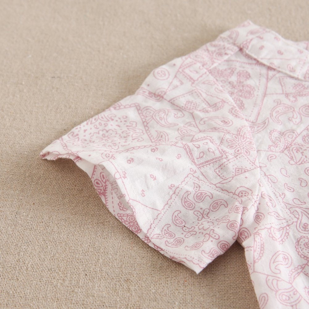Conjunto bebé niño; camisa manga corta blanco estampado rosa empolvado, con botón en cuello. Short empolvado rayas.