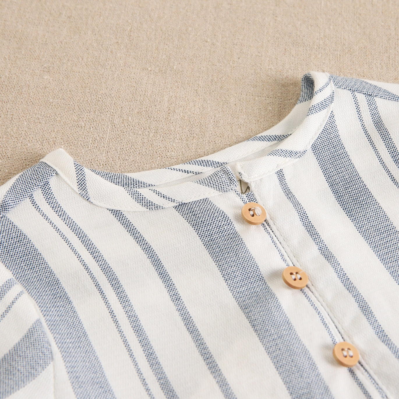 Conjunto de bebé niño con camisa de rayas azules y blancas, cuello redondo y abotonadura delantera con botones de madera y manga larga. Pantalón corto azul.