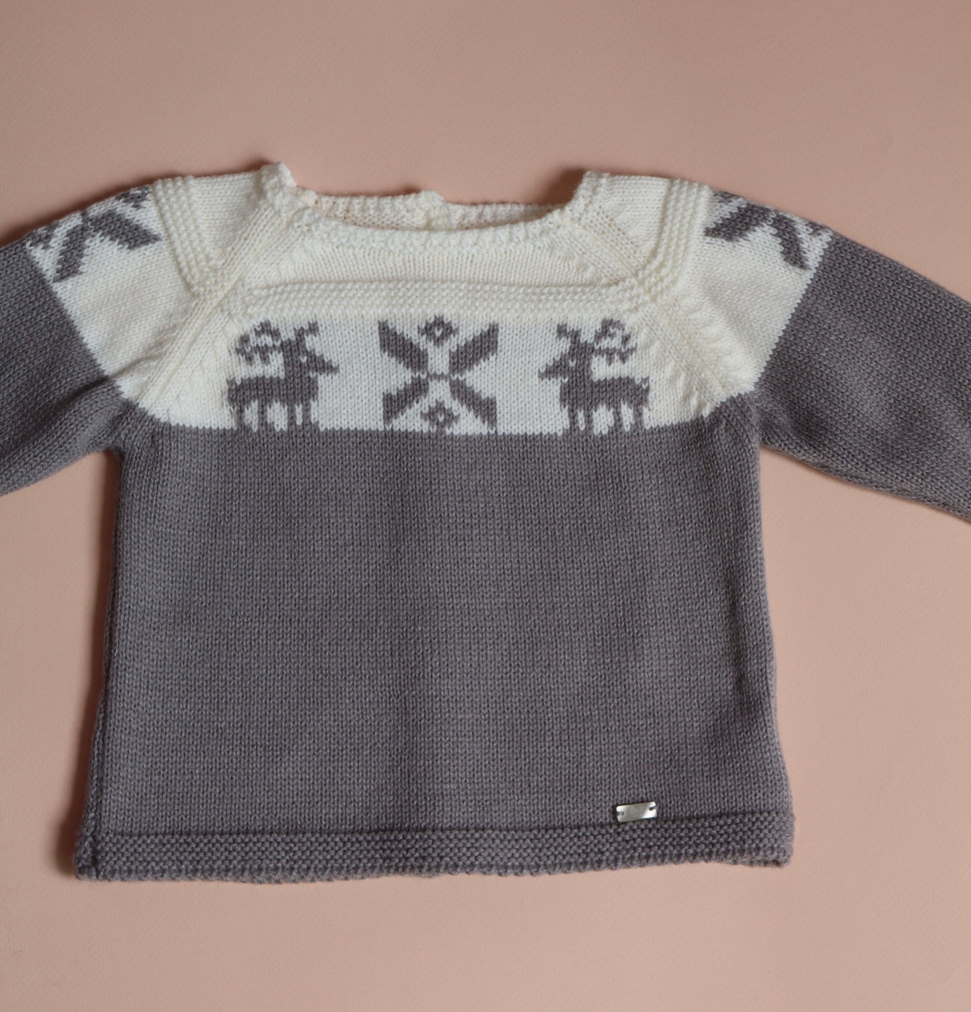 Conjunto tres piezas. Jersey gris y blanco con grecas navideñas, abotonadura en espalda, camisa blanca con cuello de bebé y y cierre mediante botones en espalda. Bombacho pana gris con botones de madera en laterales.