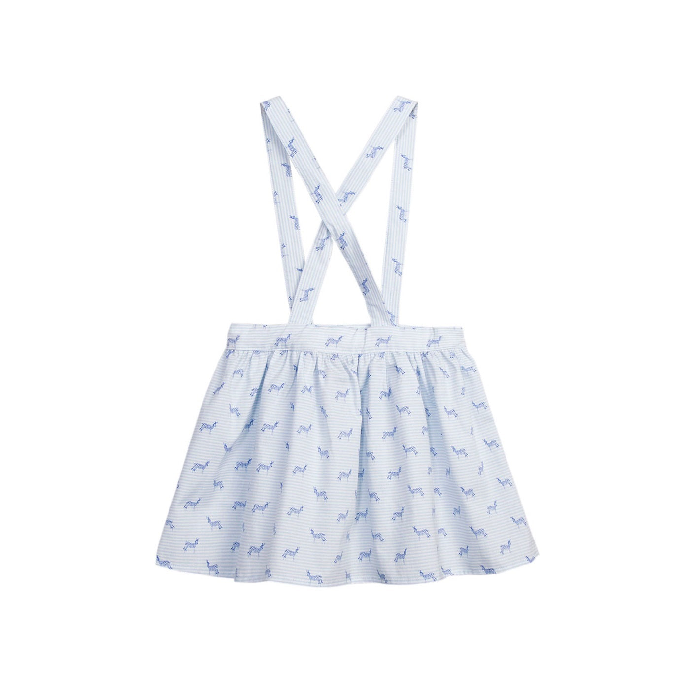 Falda para niña estampado rayas con cebras en tonos azules. Tirantes cruzados en espalda, botones en tosa la falda en parte delantera.