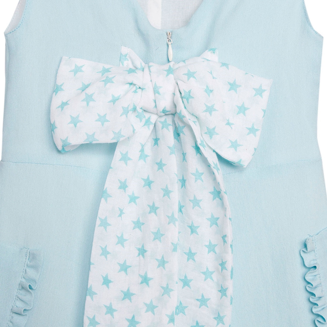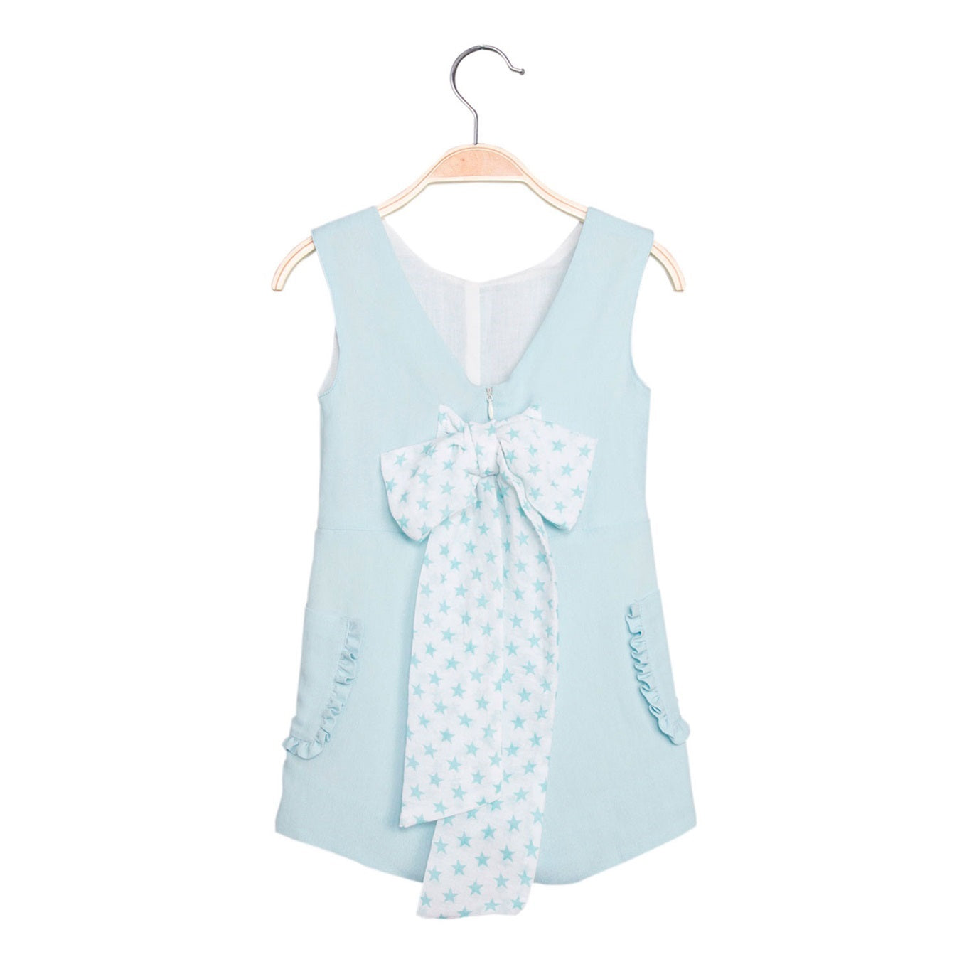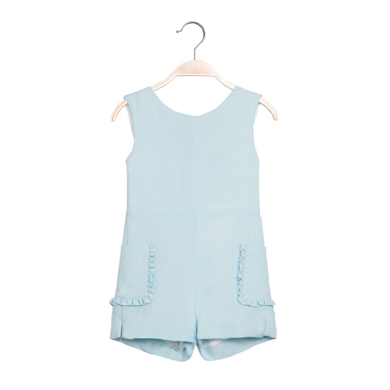 Jampisuit corto color aguamarina, bolsillos con detalle en volante a los lados. Escote en espalda en pico, cierre mediante cremallera y lazada en espalda.