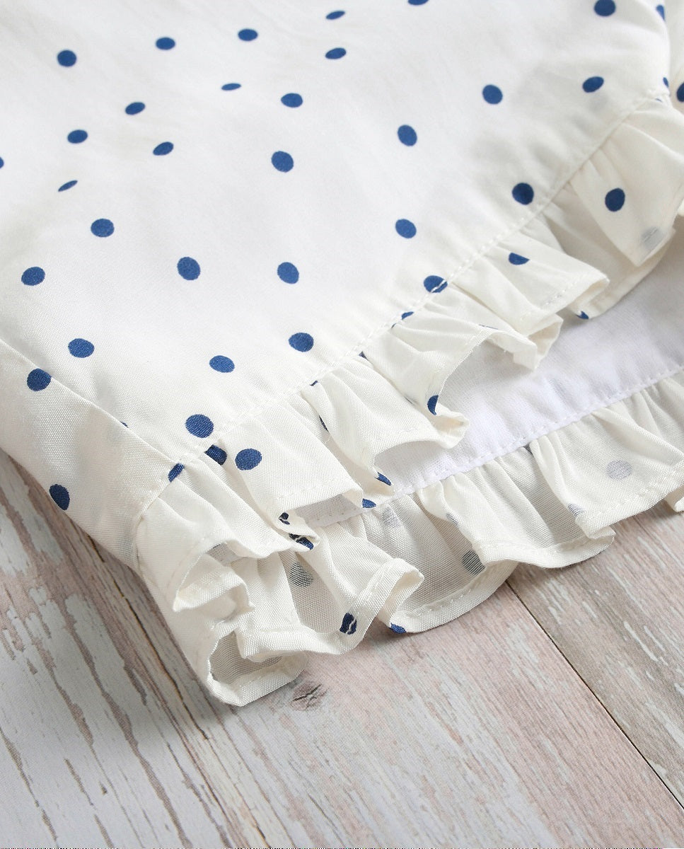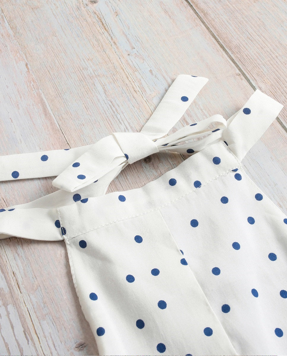 Jampisuit corto blanco con estampado en lunares azules, volante en pernera y resorte en cintura en la espalda. Cierre en espalda mediante lazada en cuello.