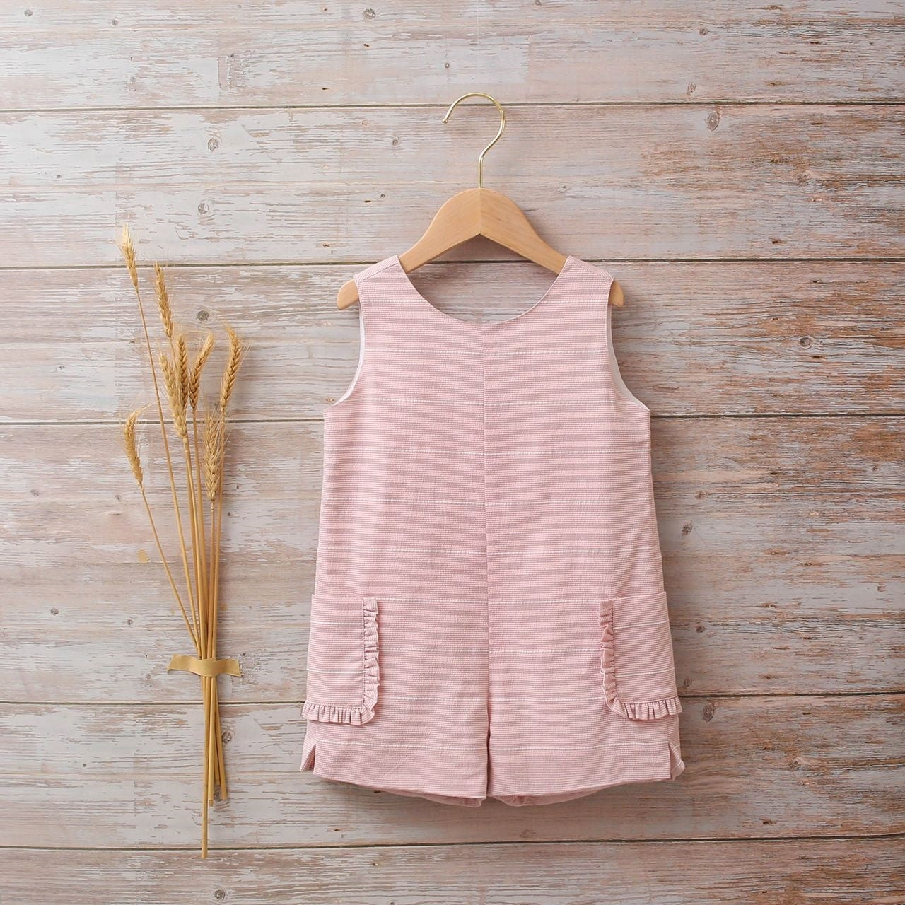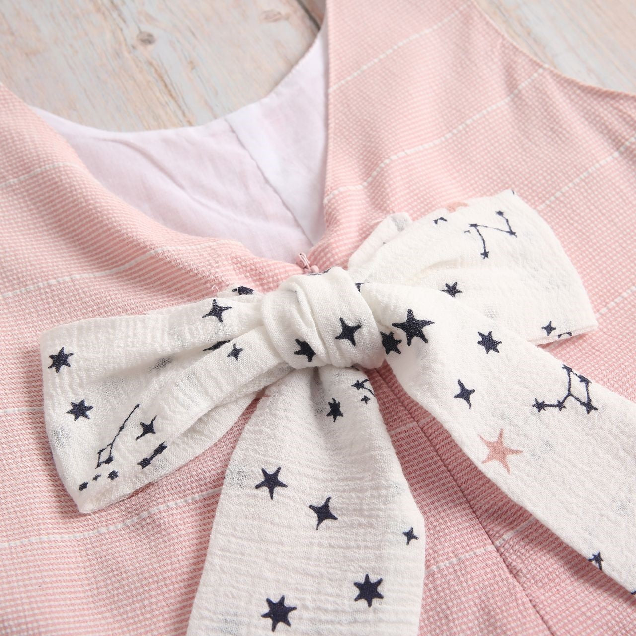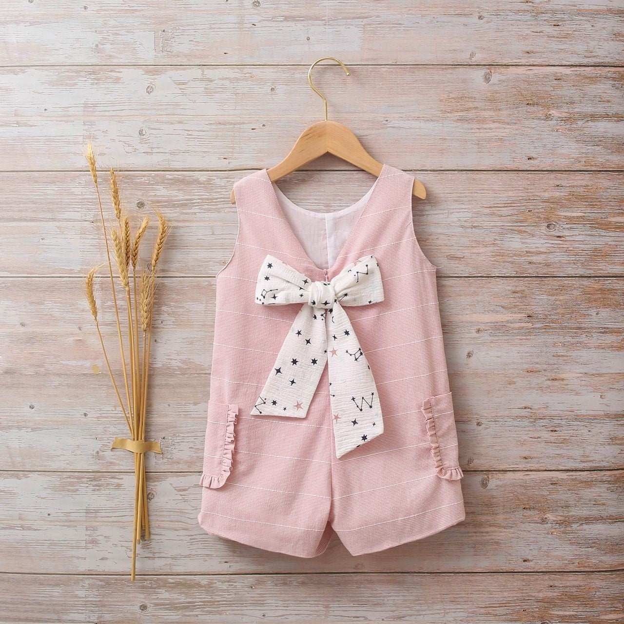 Jampisuit Jr corto estampado rayitas en rosa, bolsillos laterales y cuello redondo. Cierre en espalda mediante cremallera, y lazada en estampado estrellas.