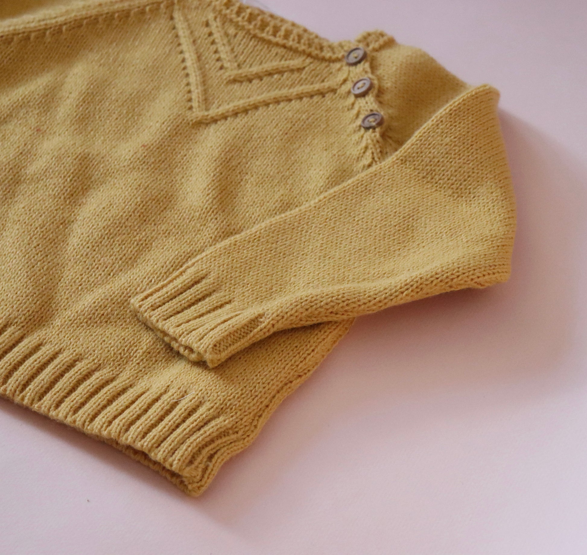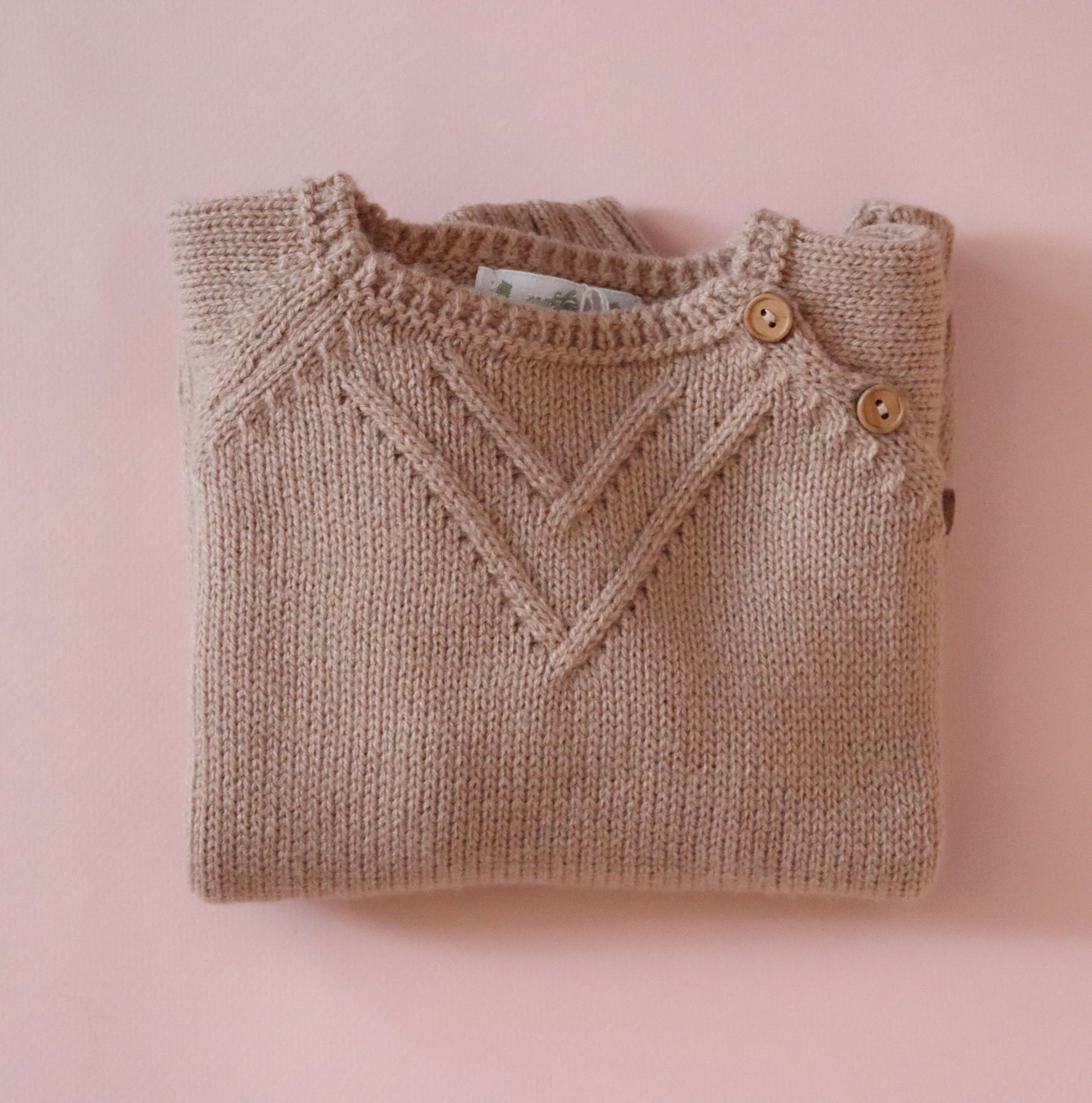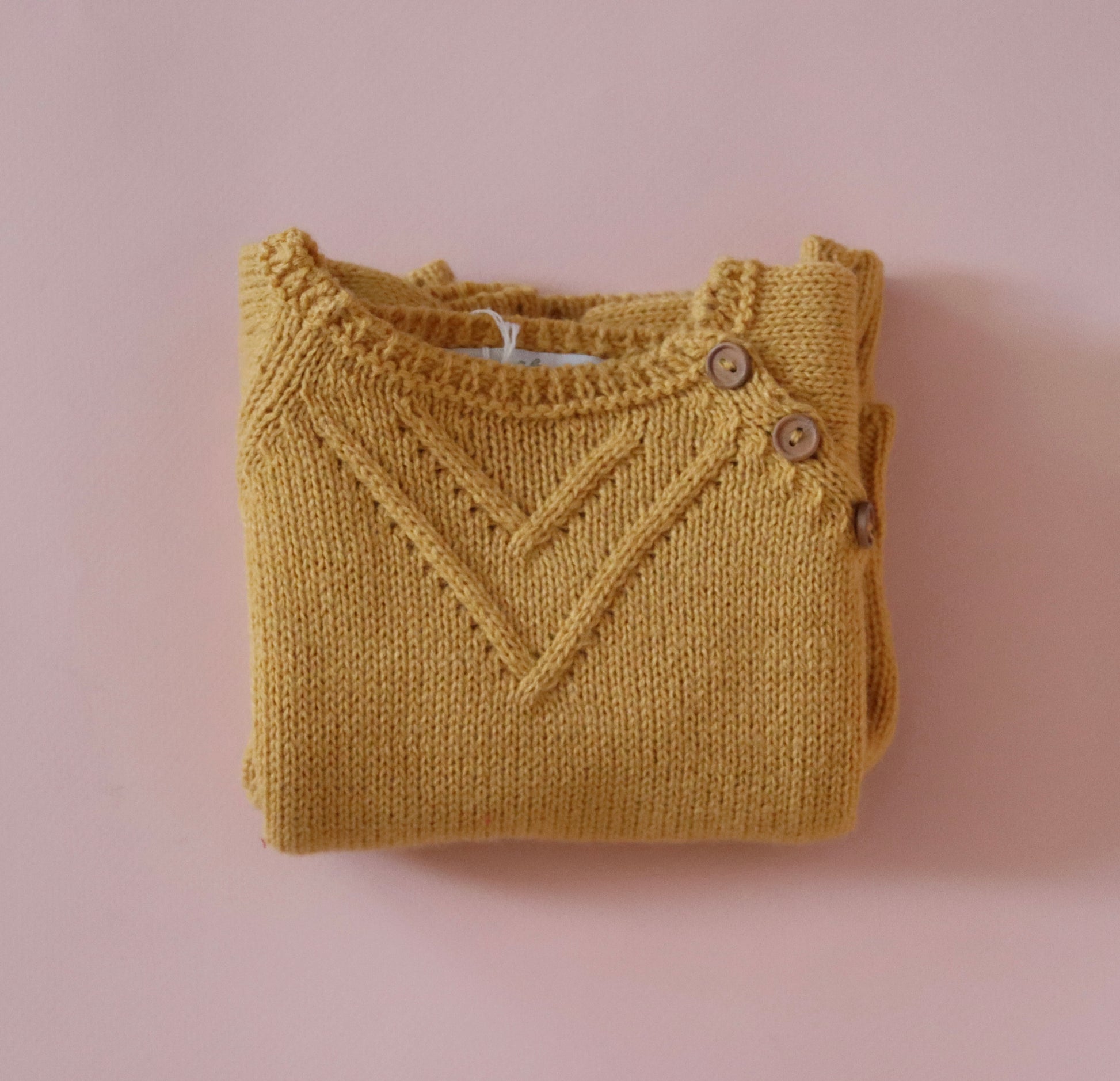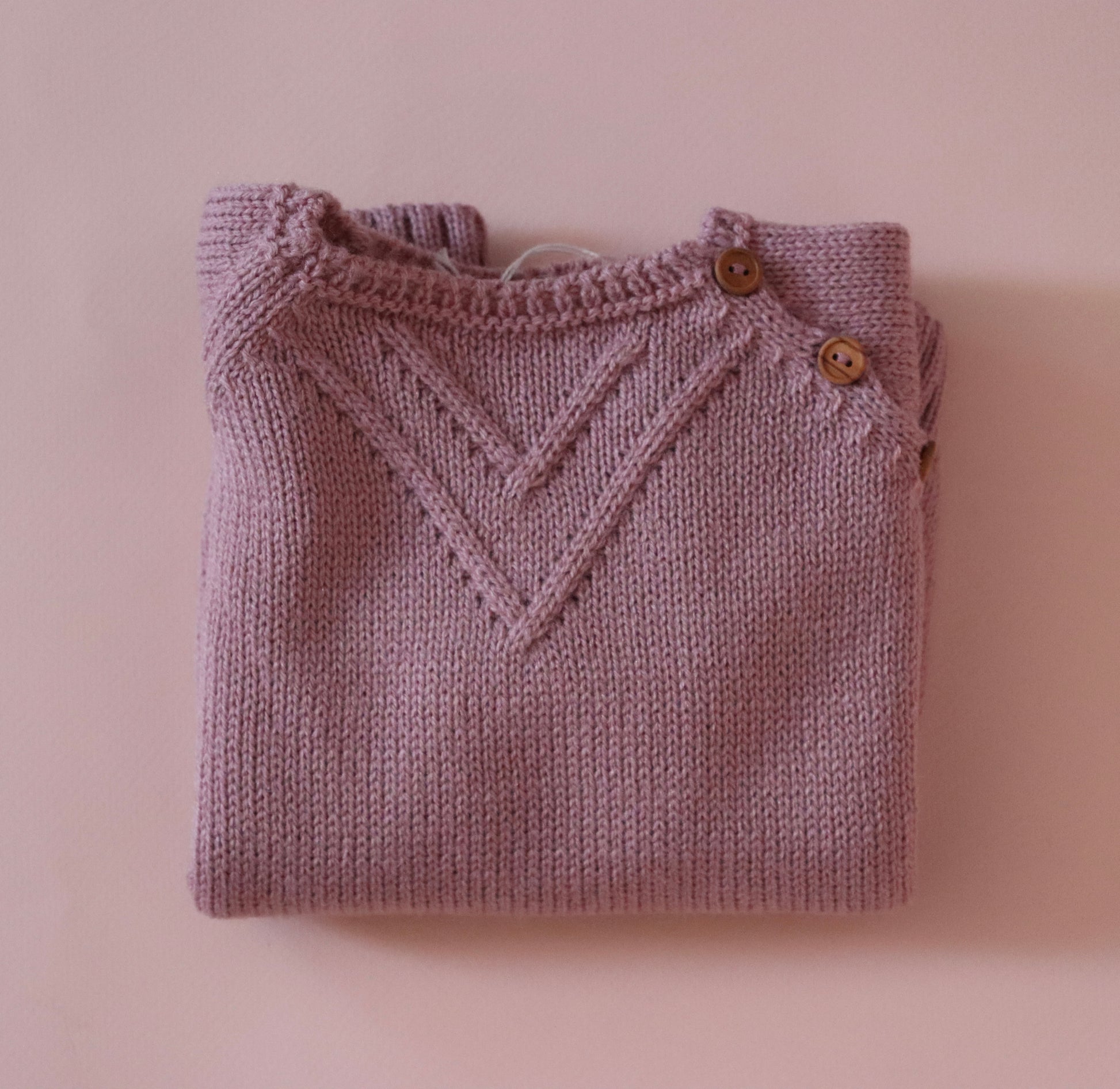 Jersey bebé unisex, cuello redondo y cierre mediante abotonadura lateral mediante botones de madera. Diseño de picos pecho.