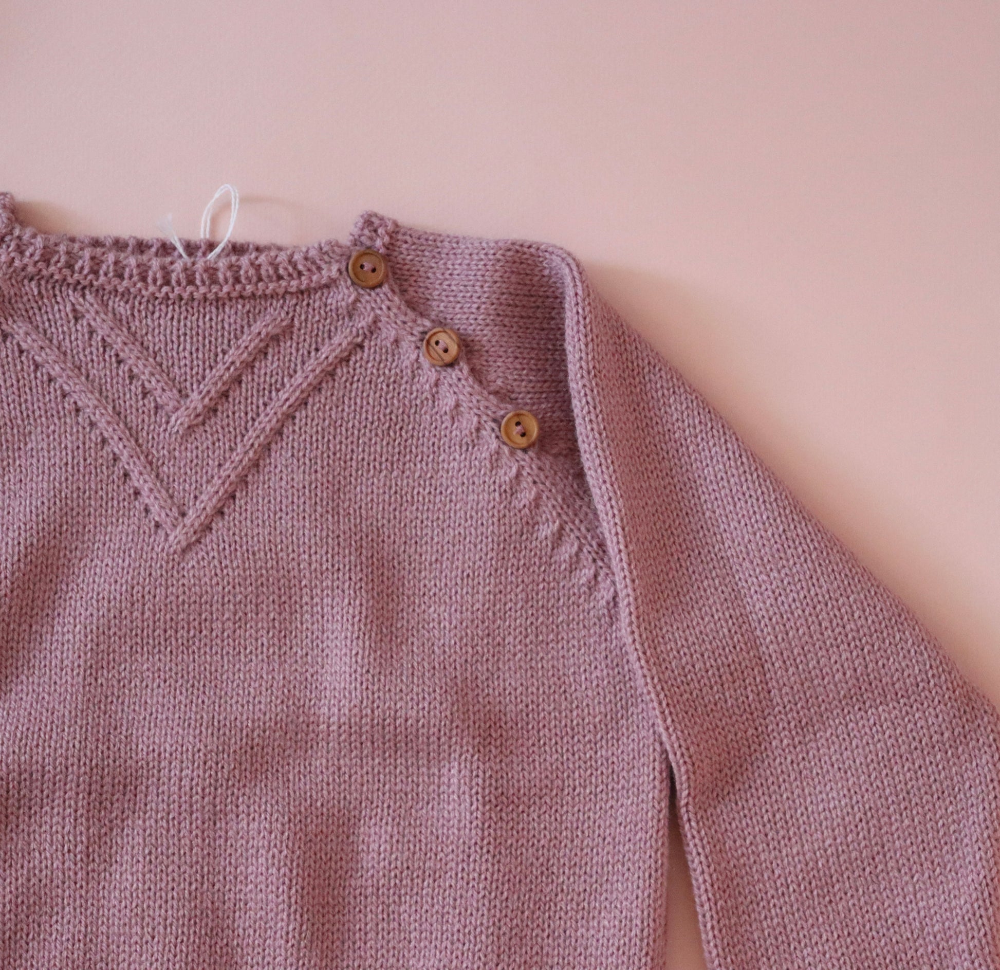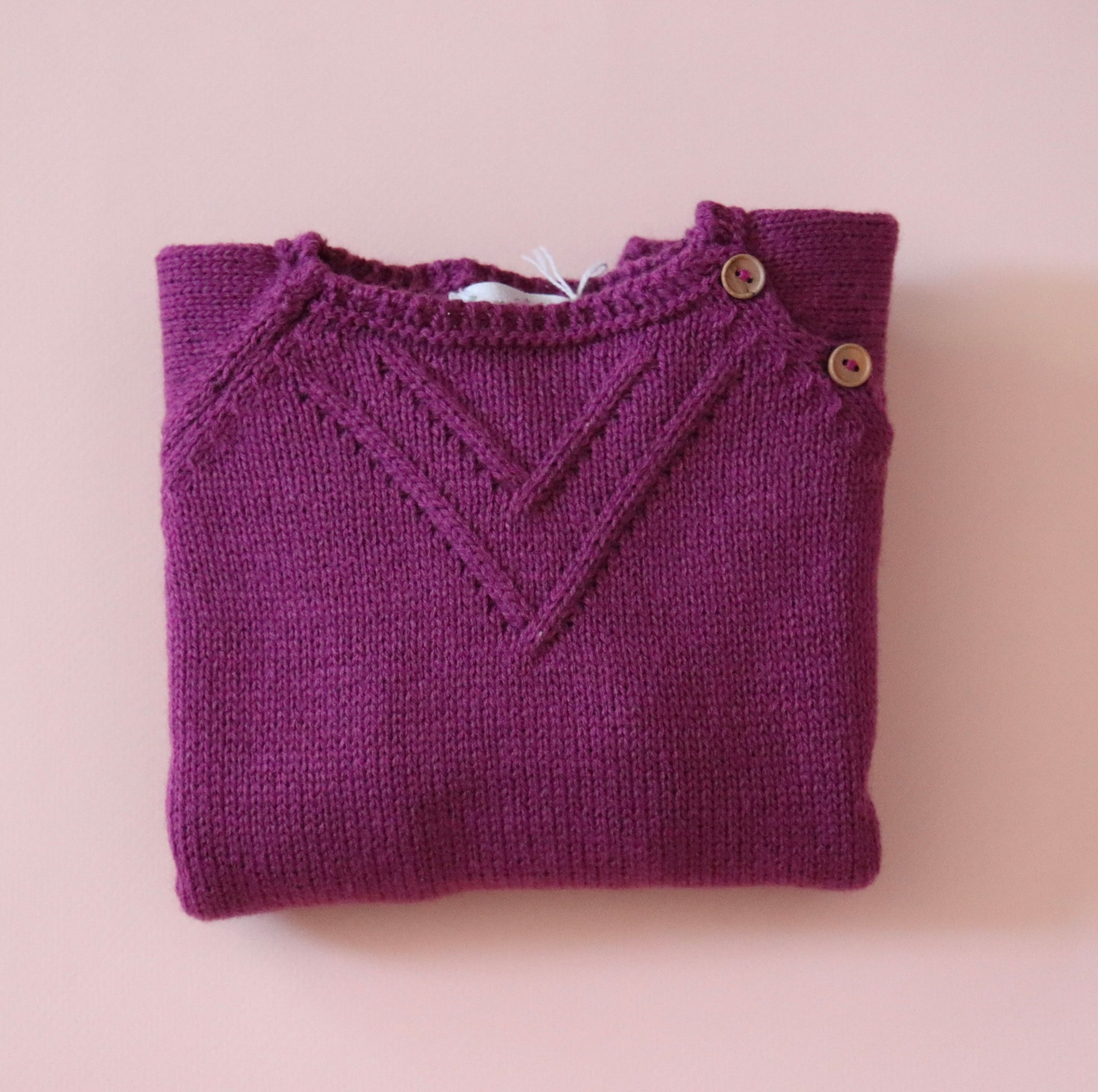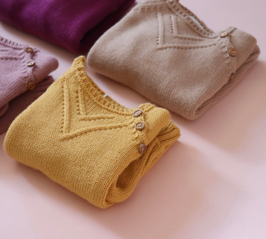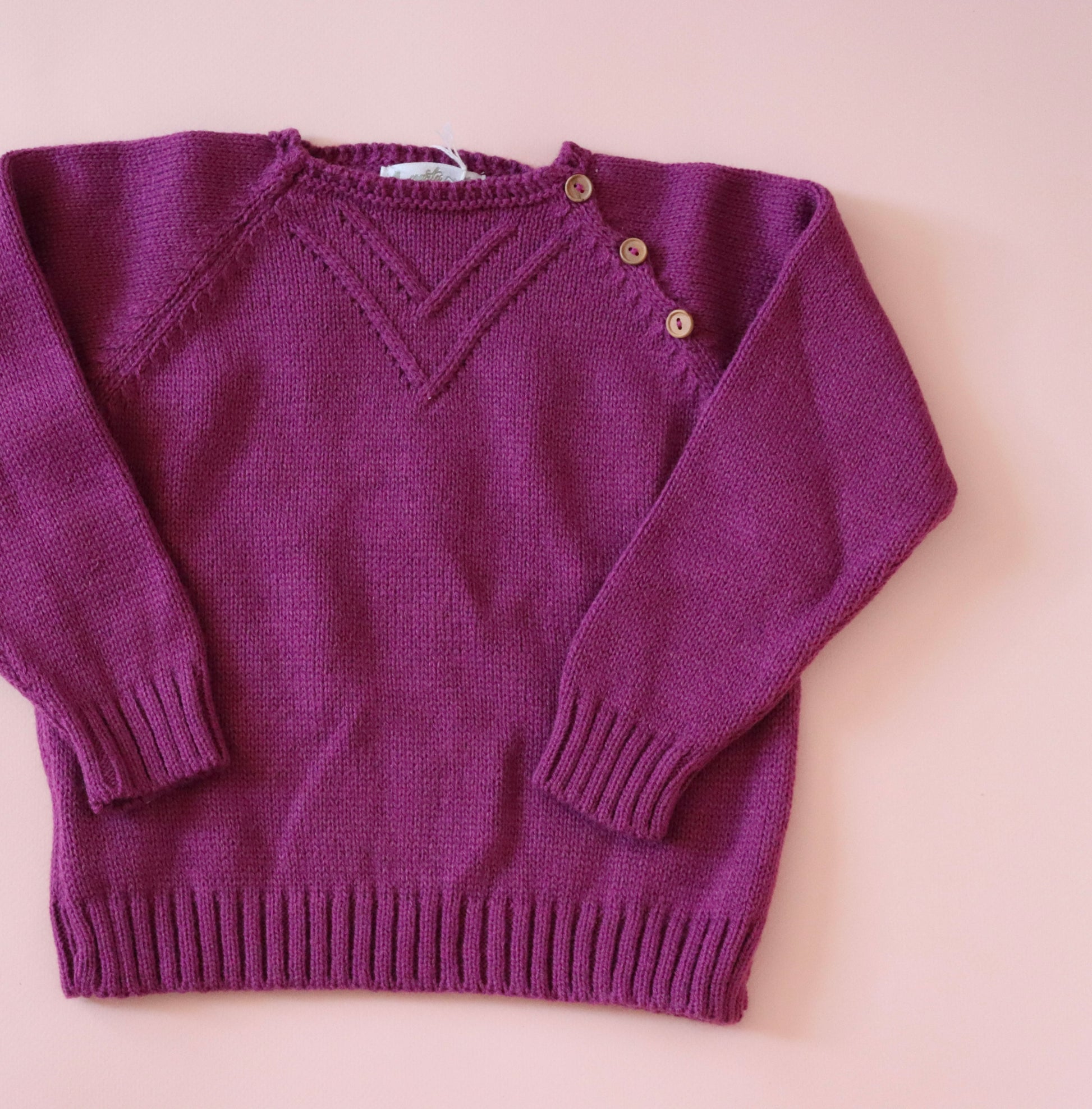 Jersey bebé unisex, cuello redondo y cierre mediante abotonadura lateral mediante botones de madera. Diseño de picos pecho.