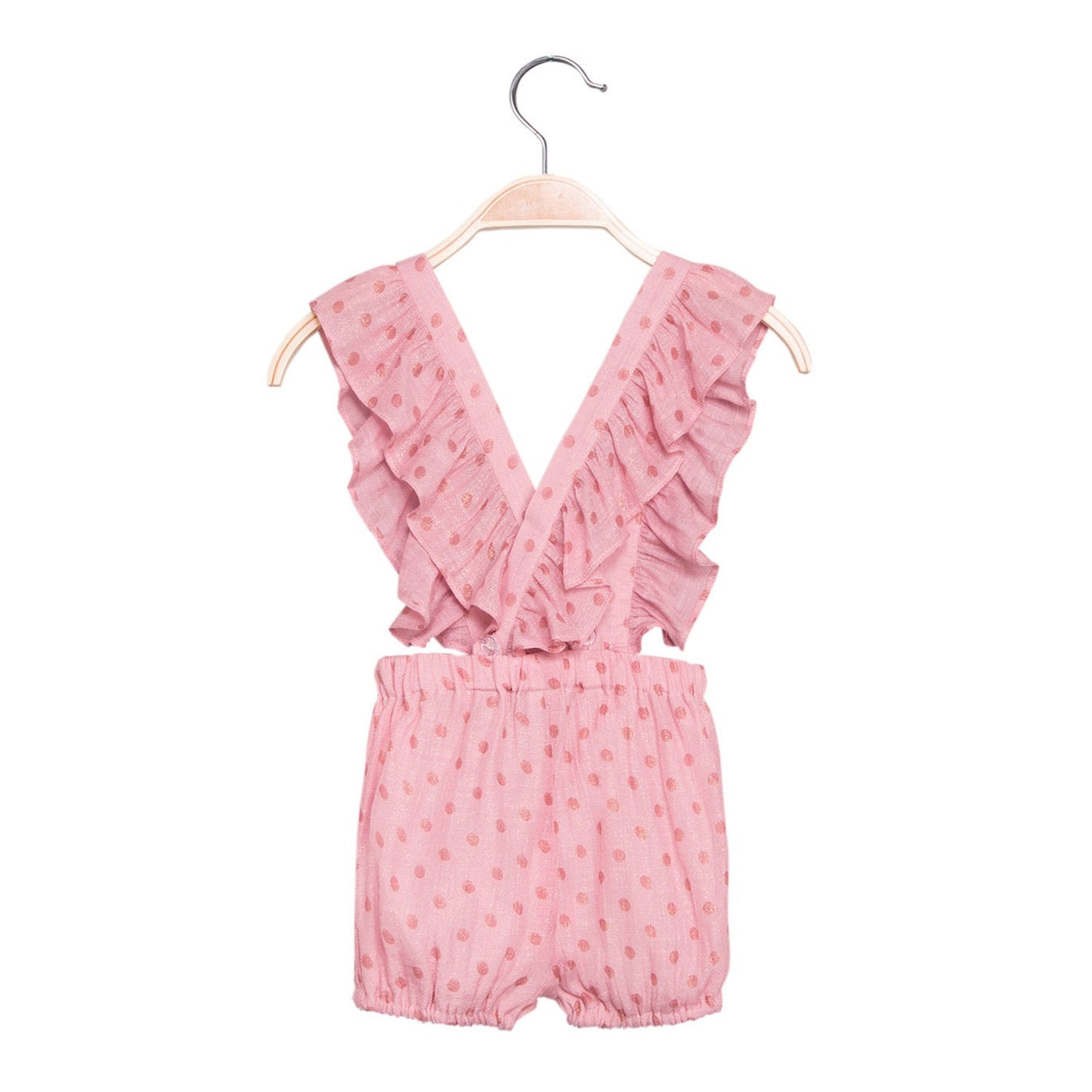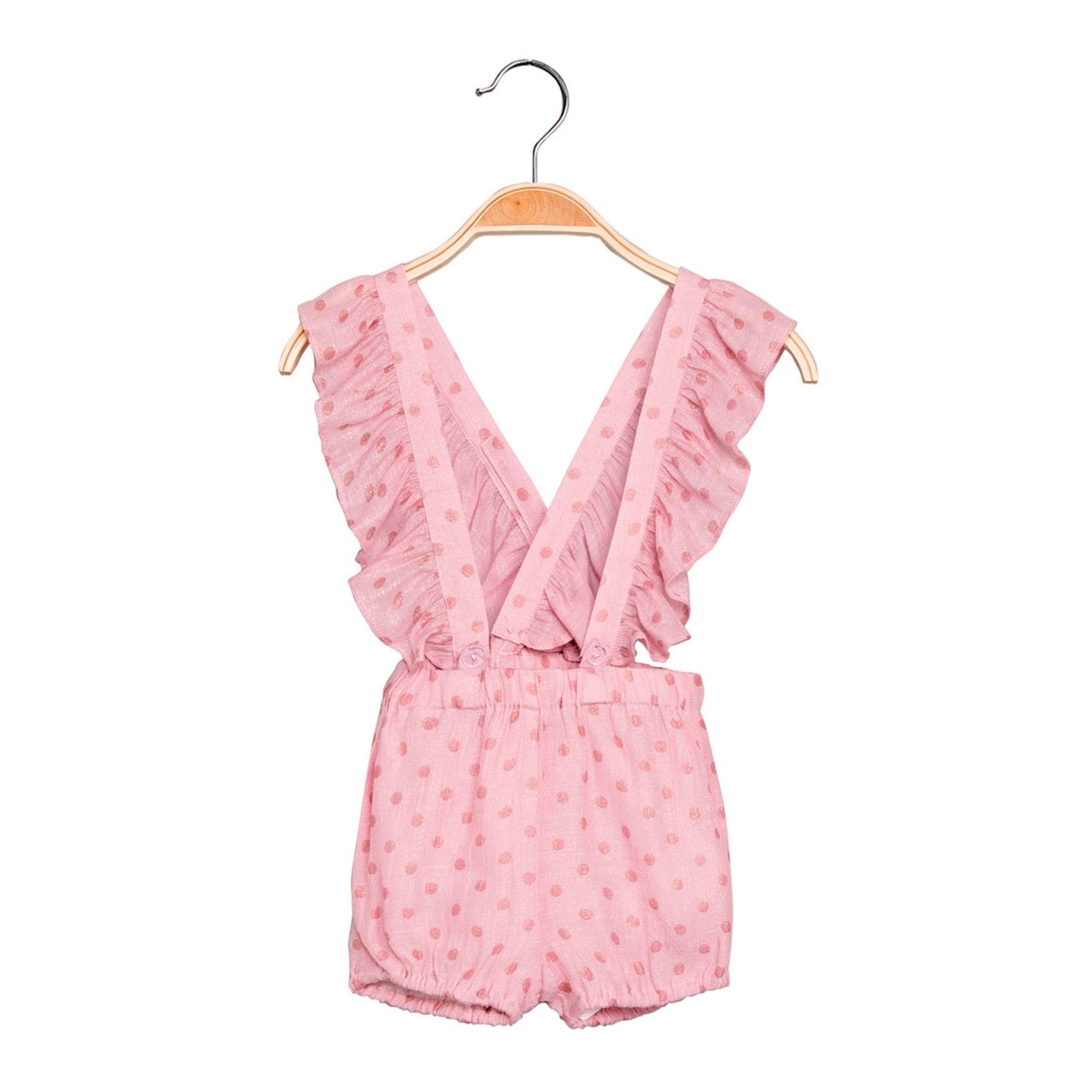 Mono para niña corto, short estilo bombacho con tirantes cruzados en espalda y volantes. Estampado fantasía lunares en tonos color rosa/fresa.