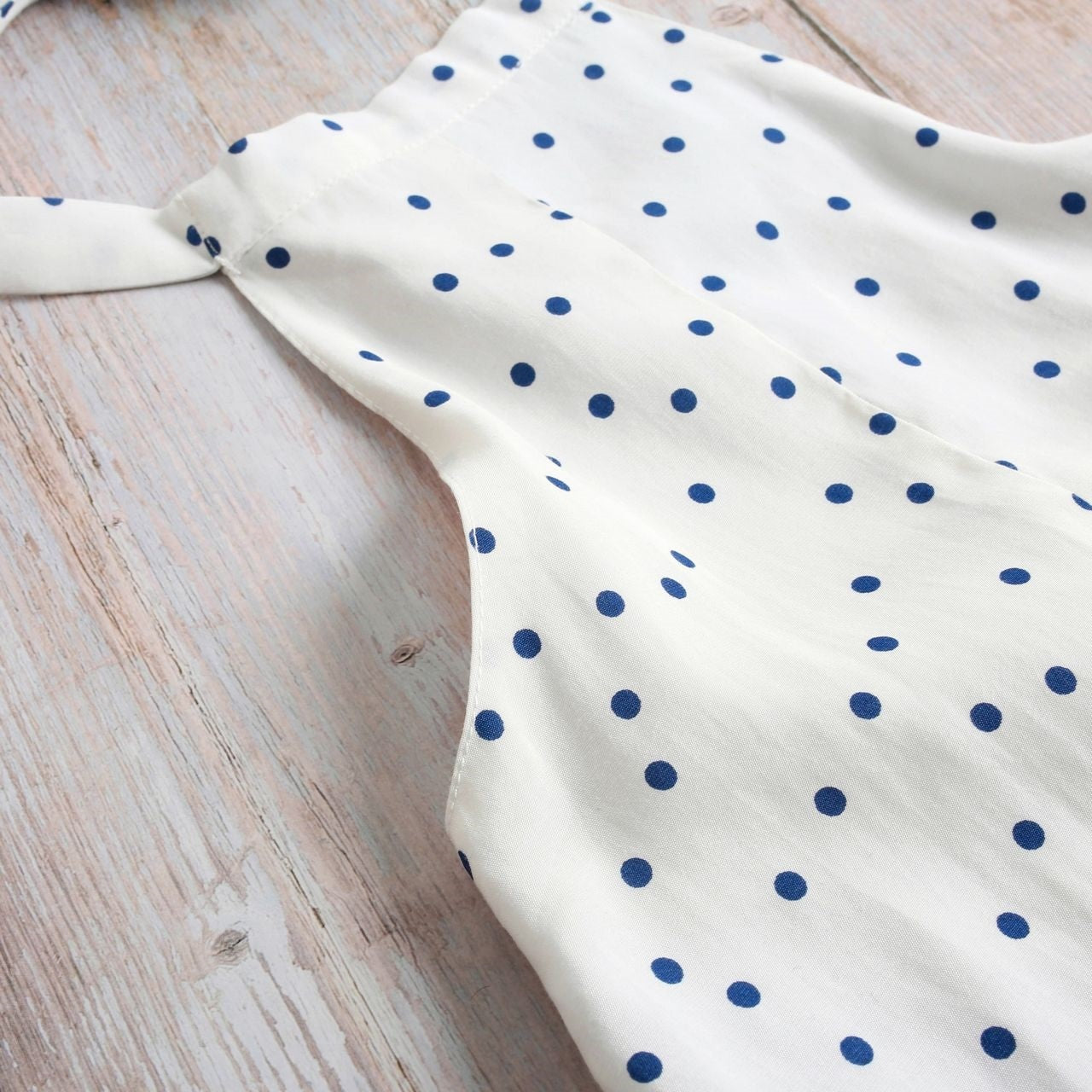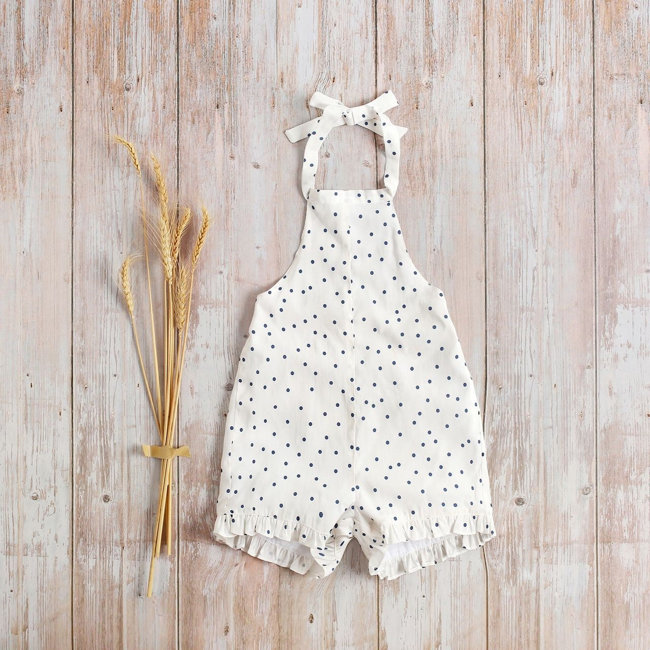 Mono corta para niña blanco estampado lunares azules, volantes en bajo del pantalón. Espalda libre con lazada ajustable en cuello.