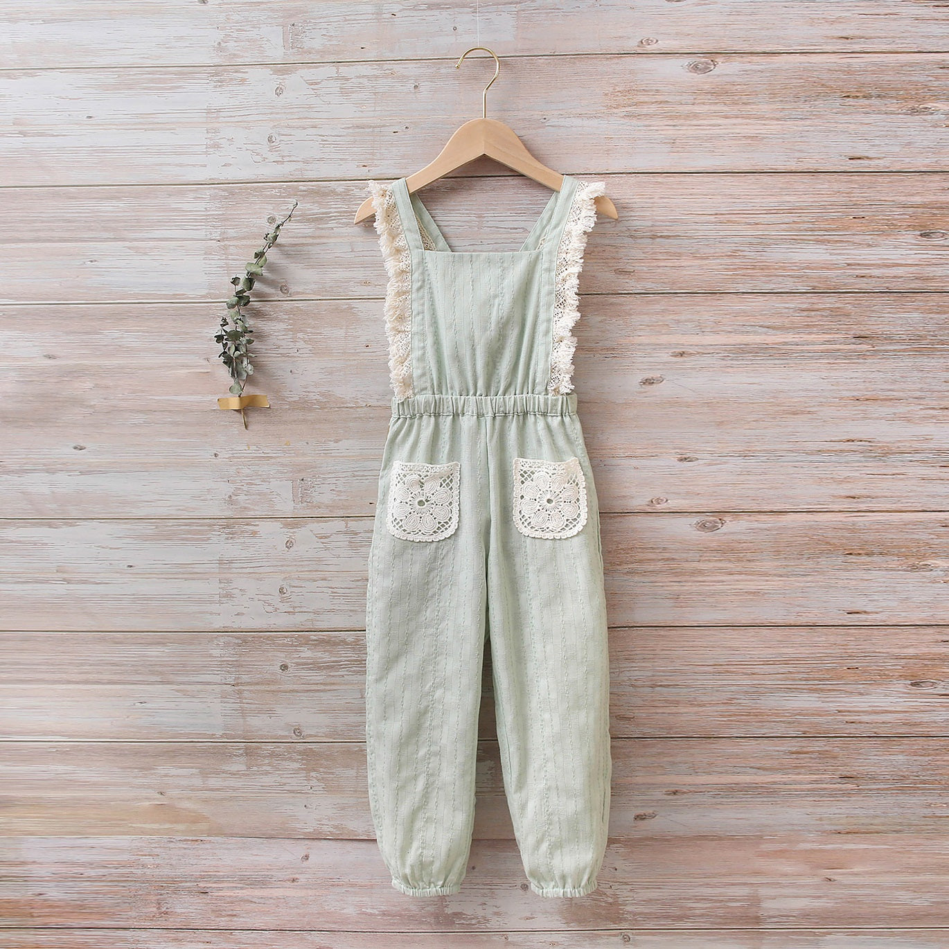 Mono largo para niña en color verde, bolsillos crochet en blanco en la parte delantera. Resorte en cintura y bajo del pie con tirantes cruzados y puntilla crochet en blanco.