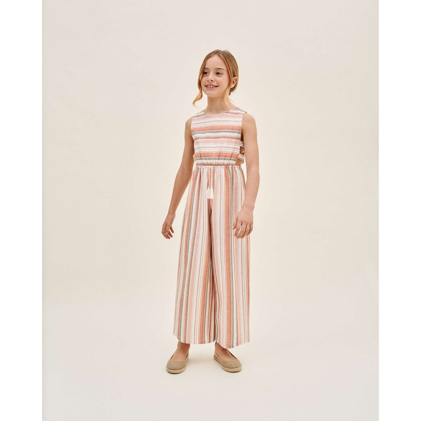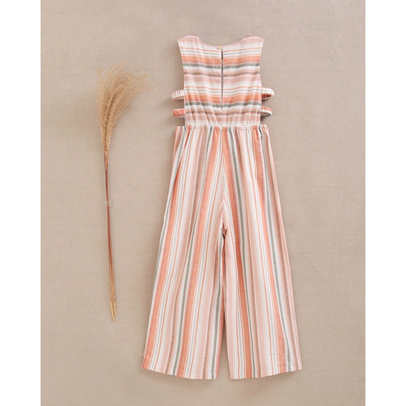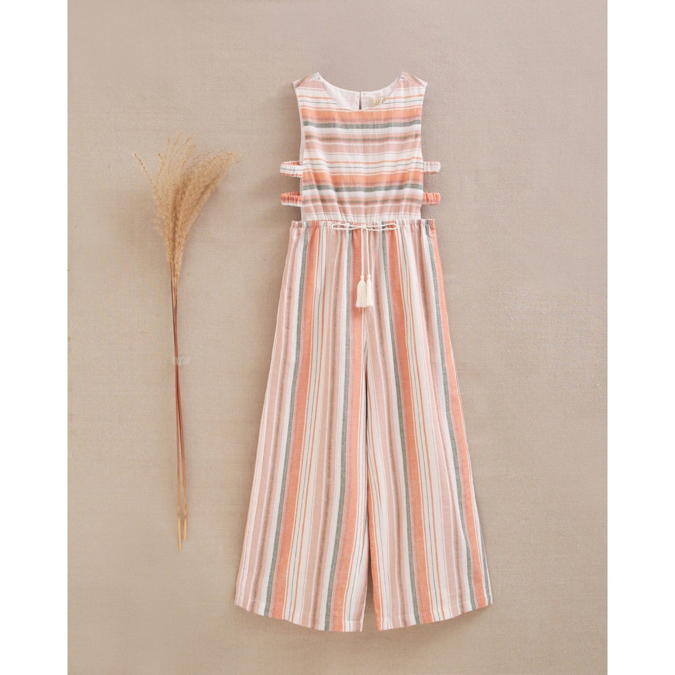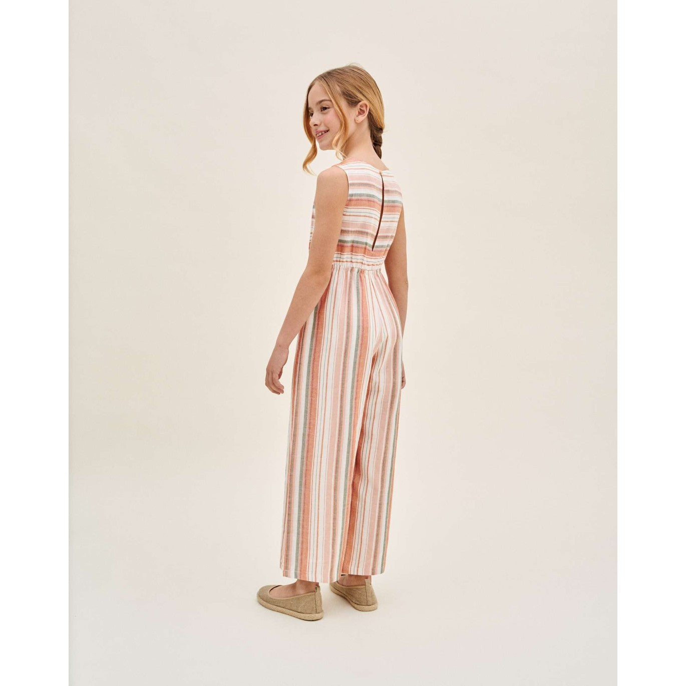 Mono niña mix rayas naranjas, verdes y blancas, con doble abertura lateral con tirante ancho y cuello redondo.