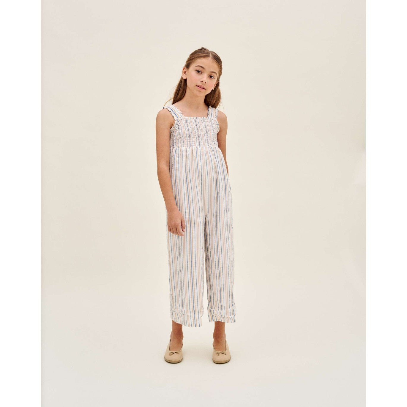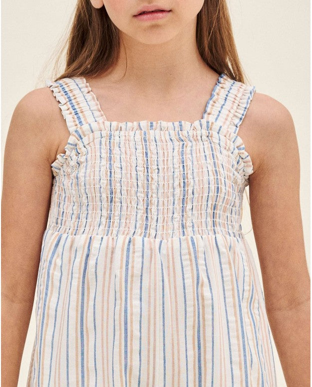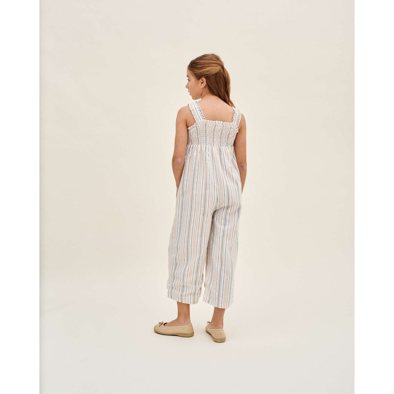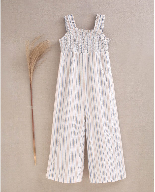 Mono larga niña estampado rayas azules y mostaza, con tirante ancho y nido de abeja en pechera.
