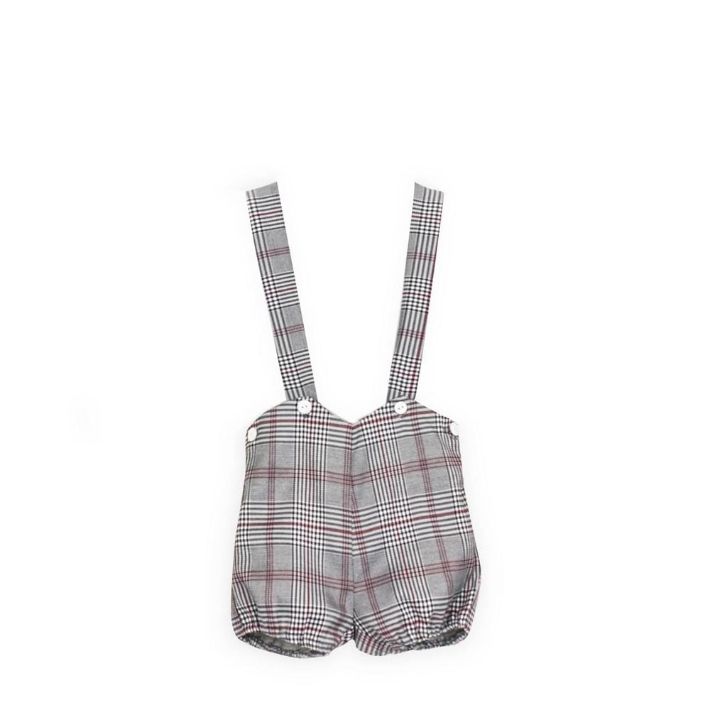 Peto bebé estampado príncipe de gales, short topo bombacho con resorte en pernera y tirantes móviles para ajustar talla mediante botones.