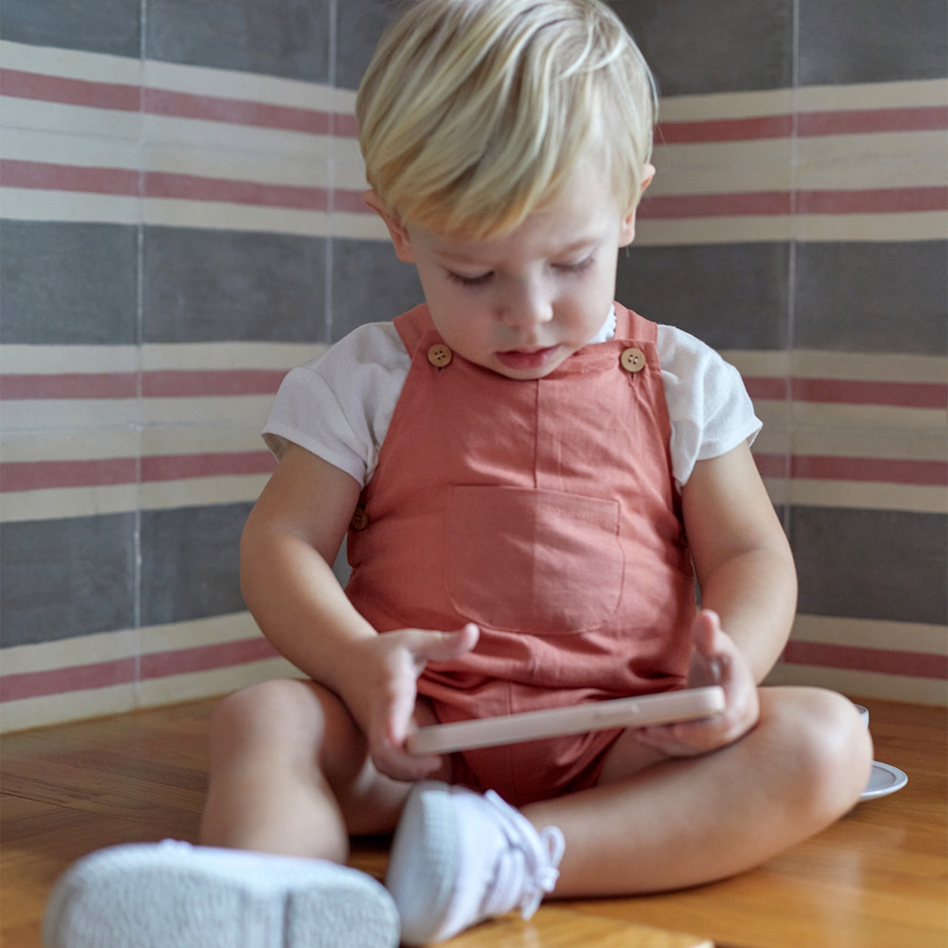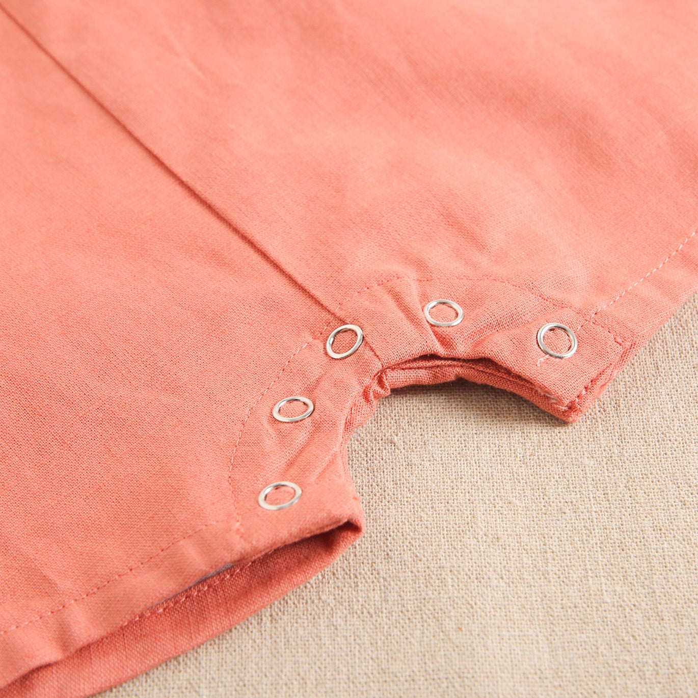 Peto para bebé niño corto color salmón. Detalle de bolsillo en la parte frontal, con apertura interior con automáticos para un cambio de pañal fácil y rápido.