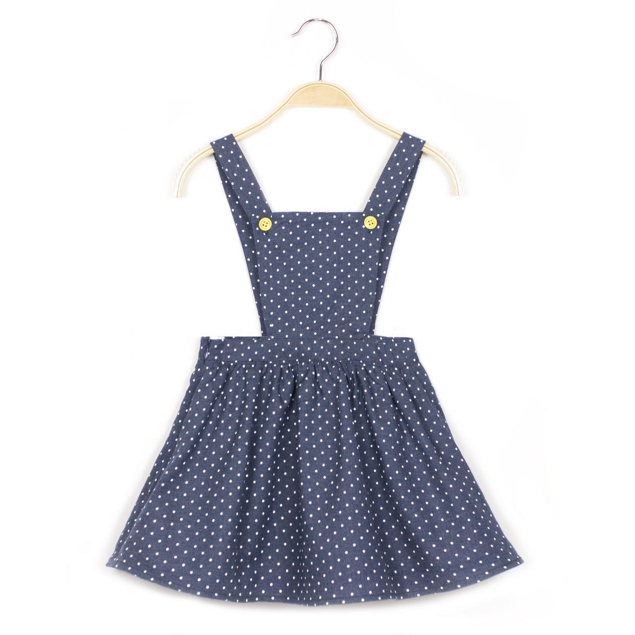 Pichi niña azul marino con estampado en lunares blancos, tirantes cruzados en espalda y botones de madera en la parte delantera.