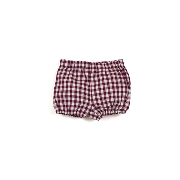 Short bebé tipo pololo, estampado cuadros grises y color granate. Con resorte en cintura y perneras.