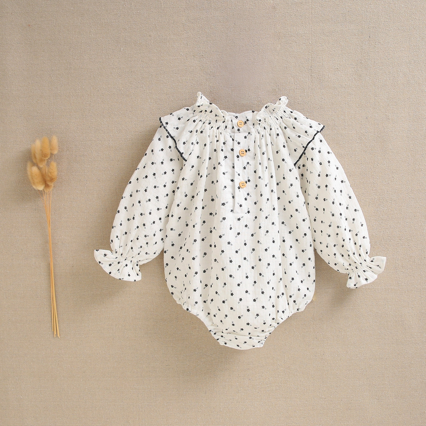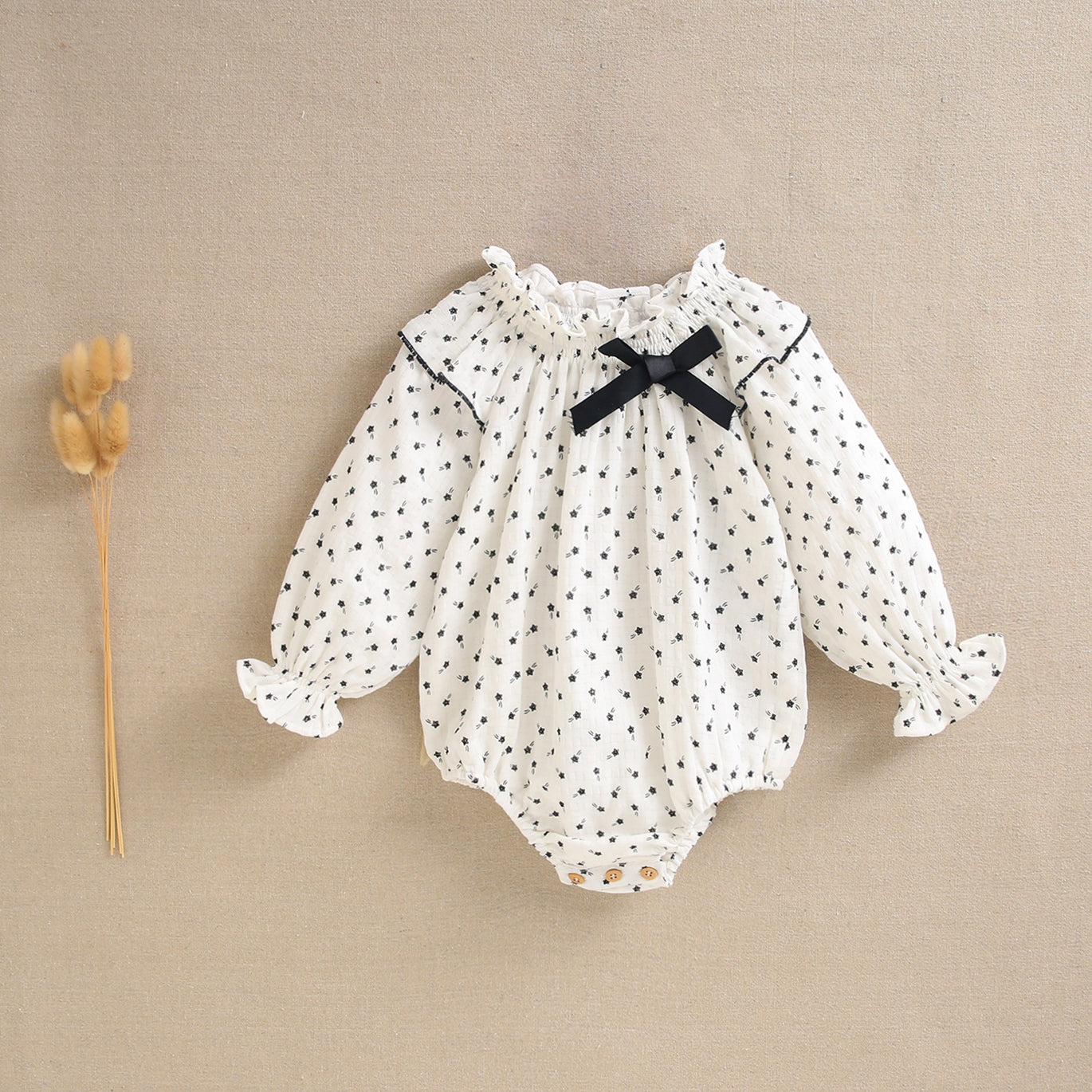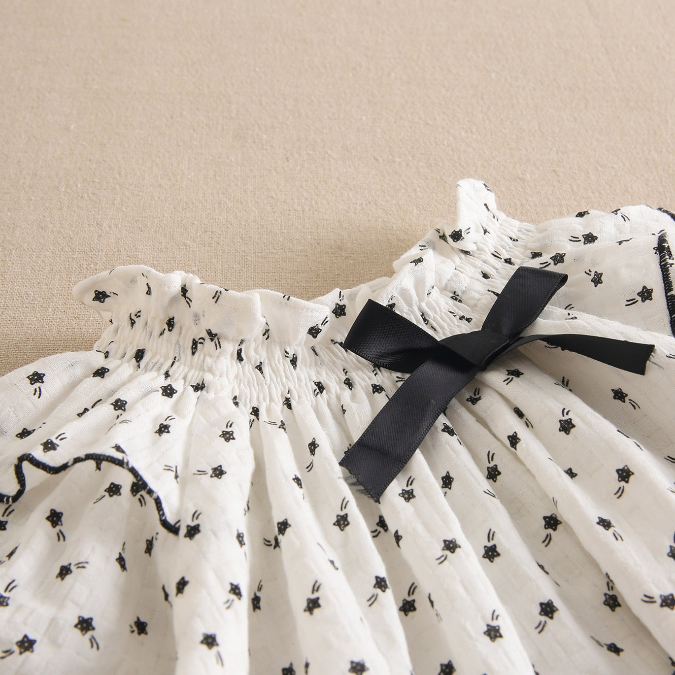 Ranita bebé niña en color blanco y estampado estrellas negras, cuello fruncido con bordado negro. Detalle de lazo negro, cierre en braguita mediante botones de madera.