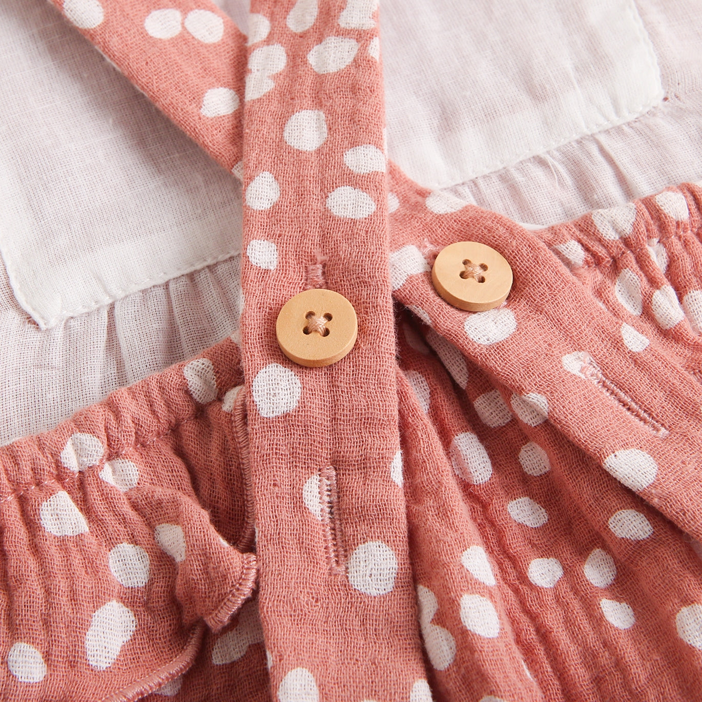 Ranita para bebé niña bámbula rosa quemado con estampando lunares blancos. Tirantes cruzados en espalda con botones para ajustar talla, detalle bordado en pechera. Cierre mediante presillas en pañalero.