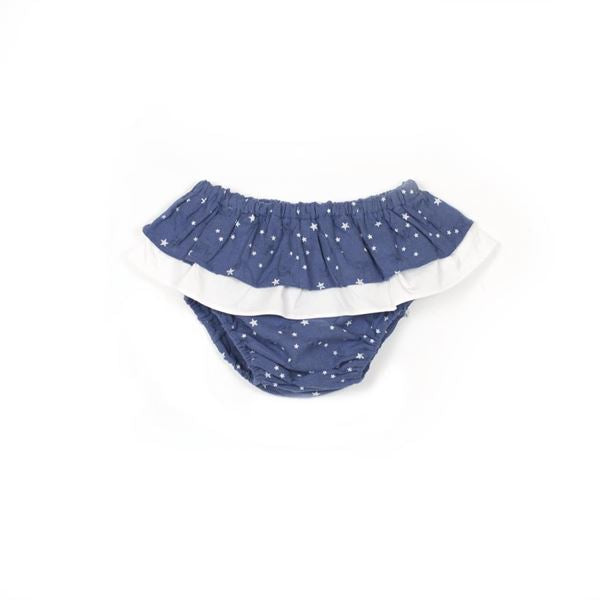 Ranita bebé azul estampado estrellas con doble volante blanco. Resorte en cintura y en perneras.