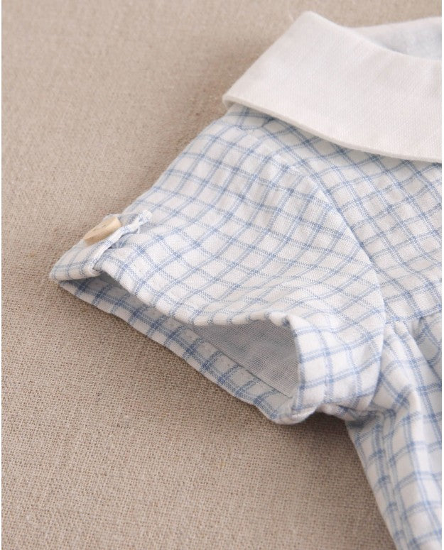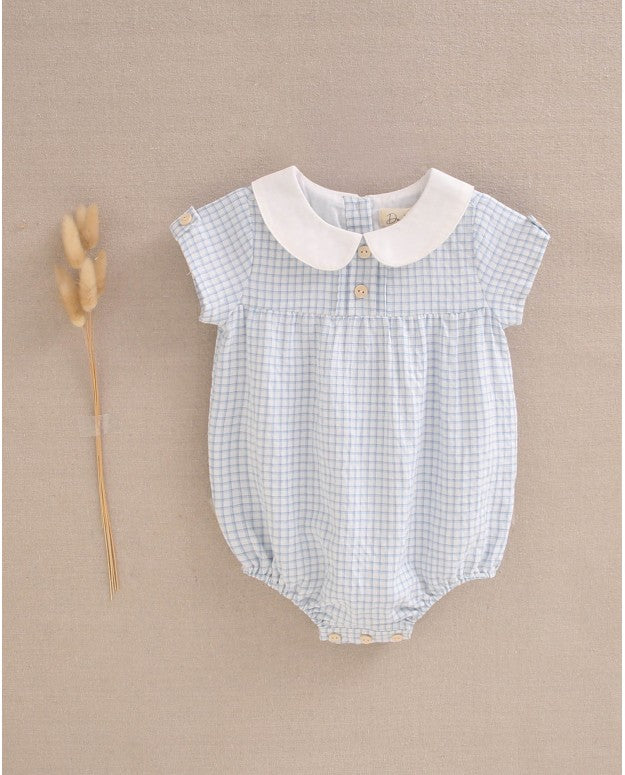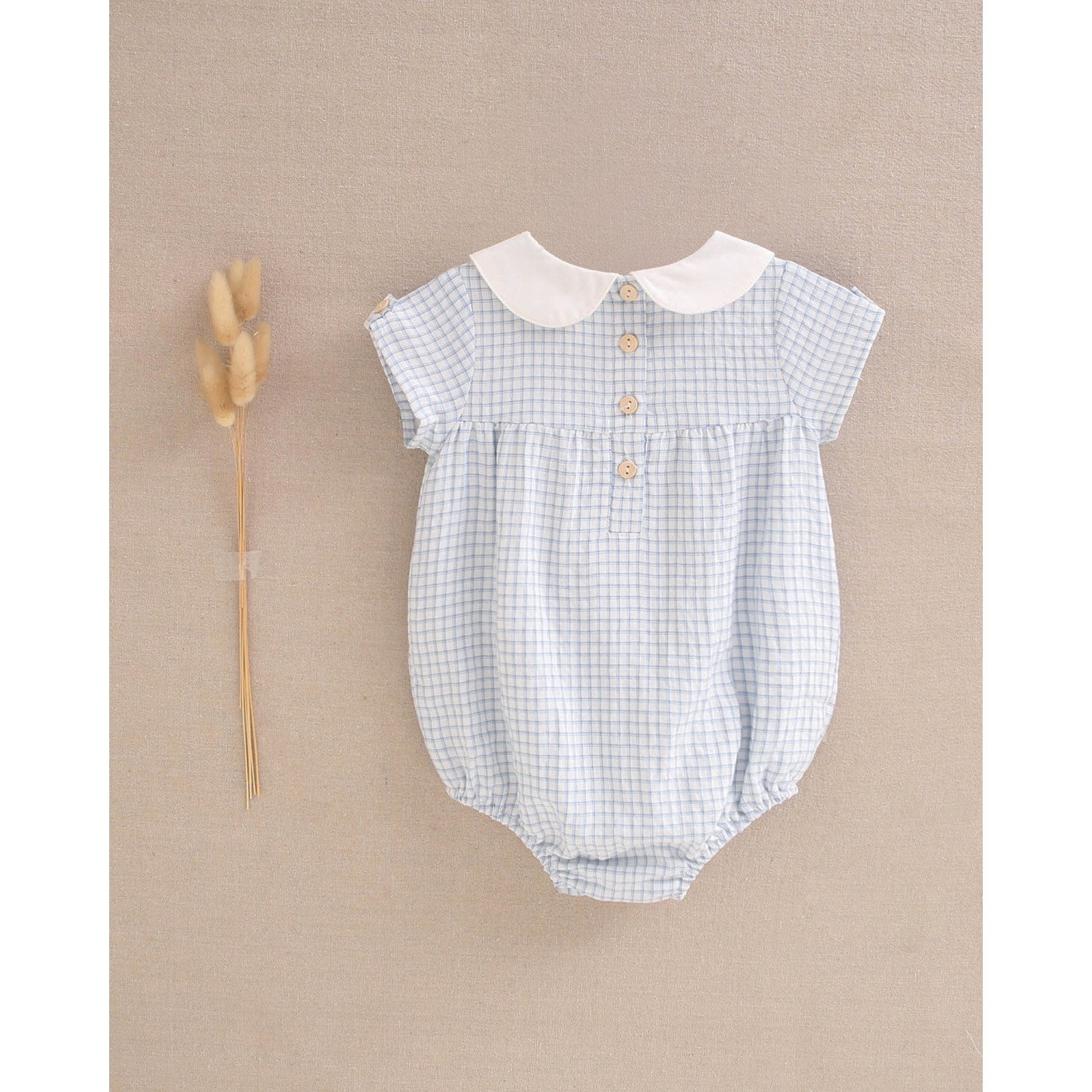 Ranita bebé niño estampado cuadro vichy azul pastel y blanco. Cuello bebé blanco y botones delanteros a media altura. Elástico en piernas y fruncido en pecho.