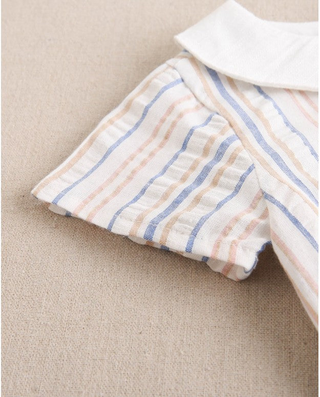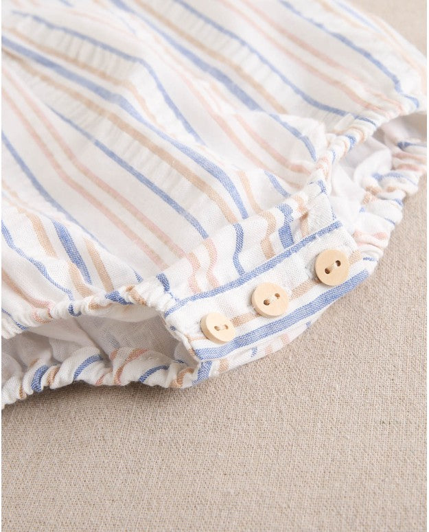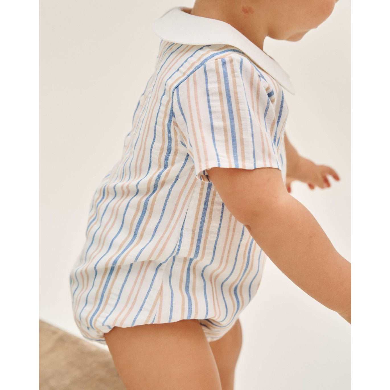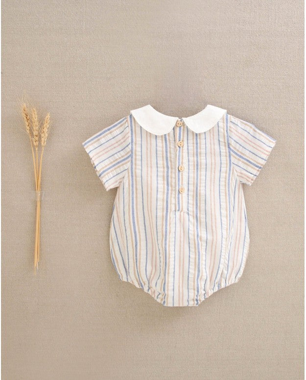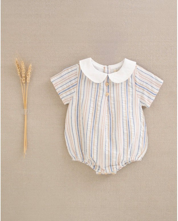 Ranita bebé niño , estampado rayas mostaza y azul con cuello bebé en blanco. De manga corta y elástico en piernas.
