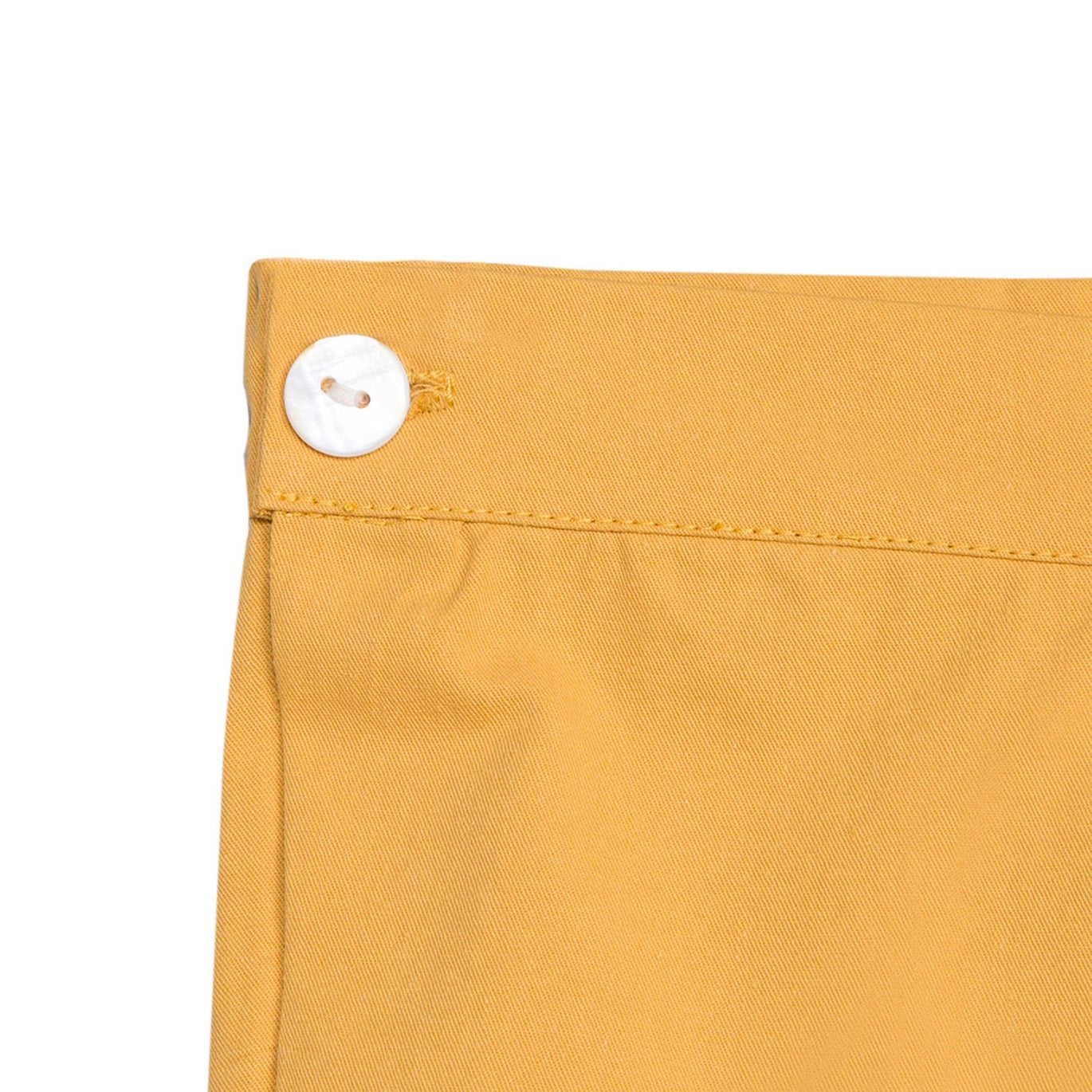 Short de bebé niño en mostaza, cierre delantero mediante botones laterales. Sistema de resorte y botón en cintura para ajustar talla.