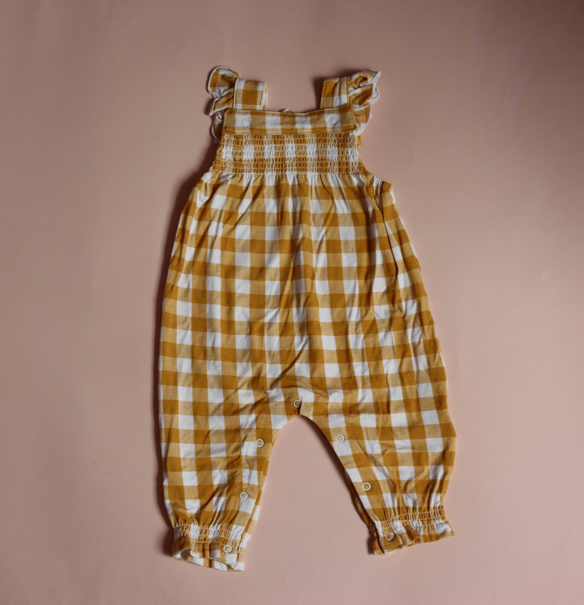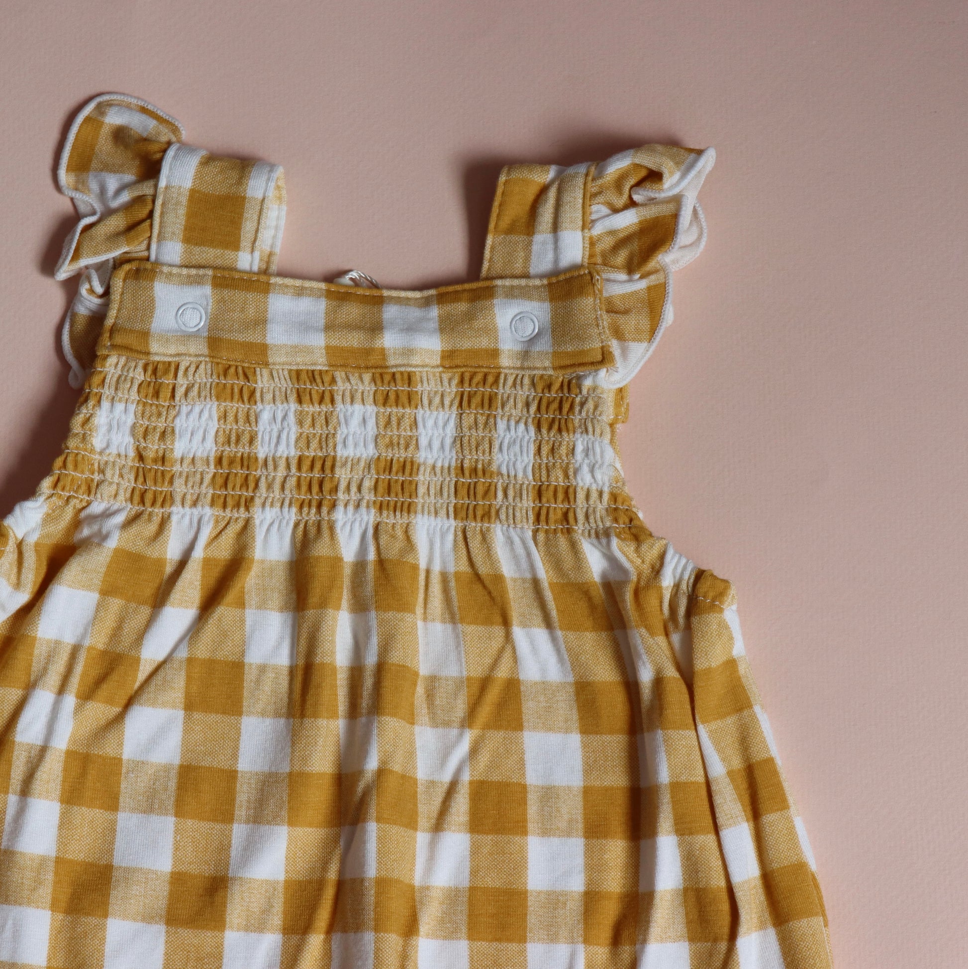 Peto estampado cuadros vichy amarillos y blancos. Olanes en tirantes, resorte en pechera y tobillos. Cierre mediante automáticos en la entrepierna.