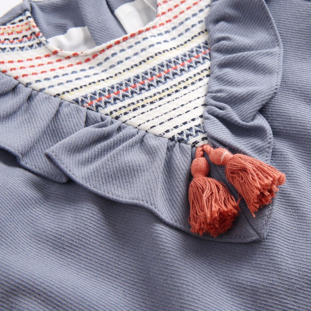 Vestido bebé tono azul petróleo, con volante decorativo en pechera con estampado étnico y borlitas decorativas. Manga larga y forro interior, cierre en espalda mediante cremallera invisible.