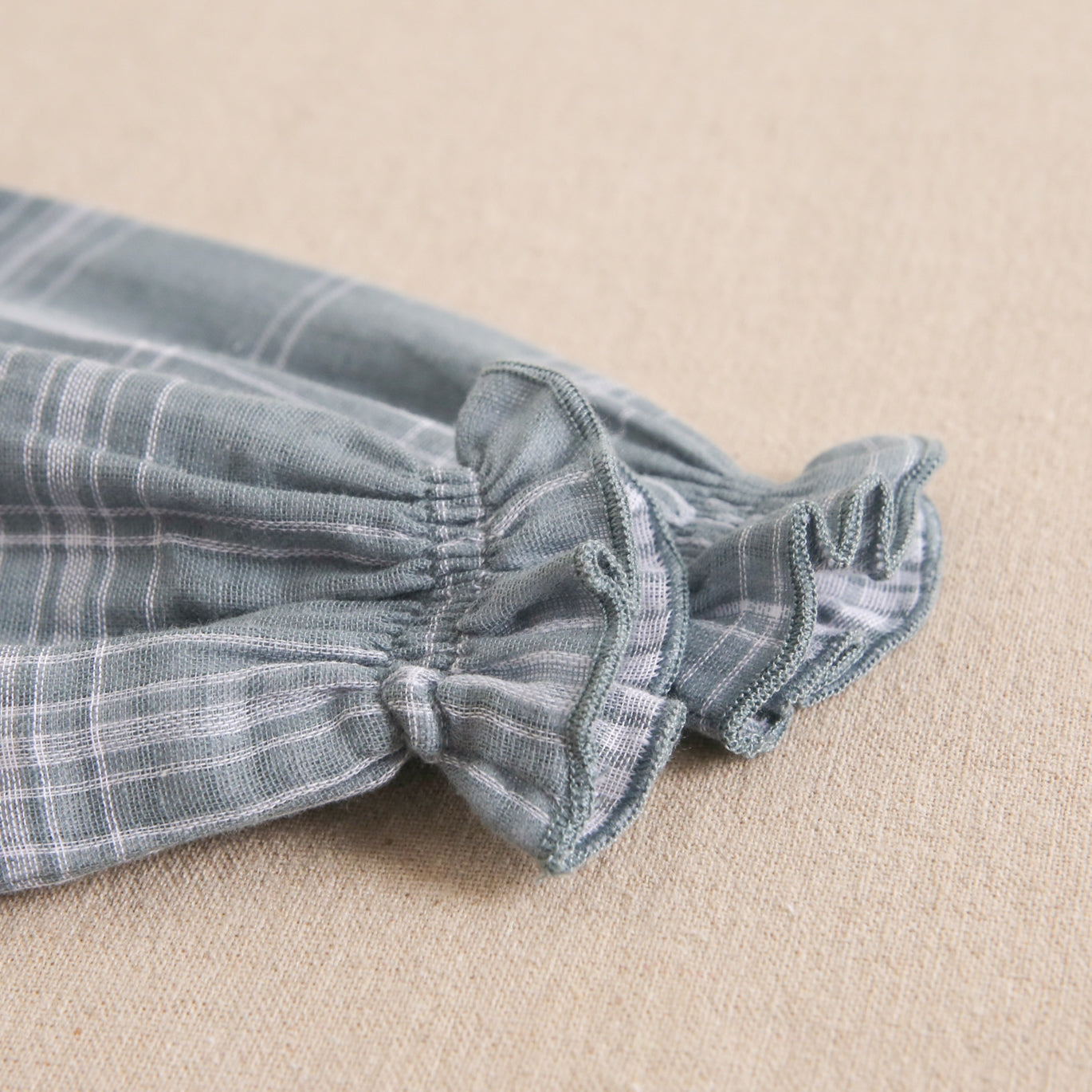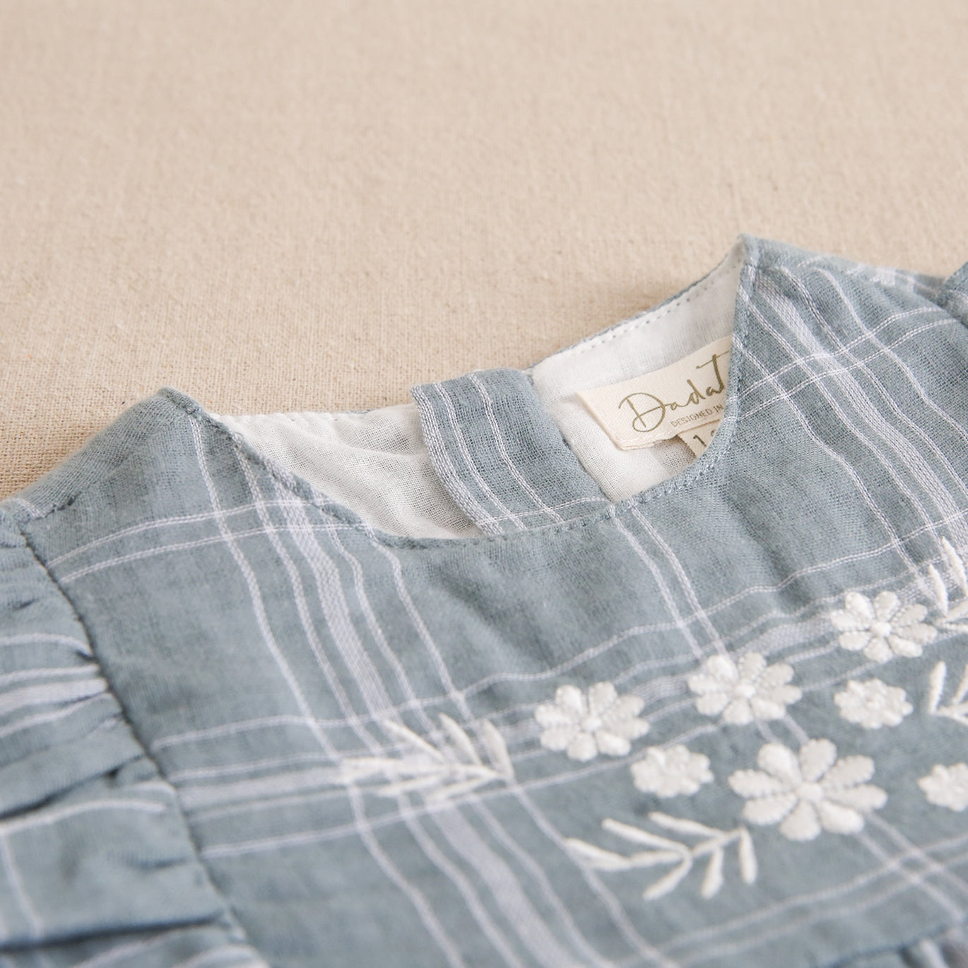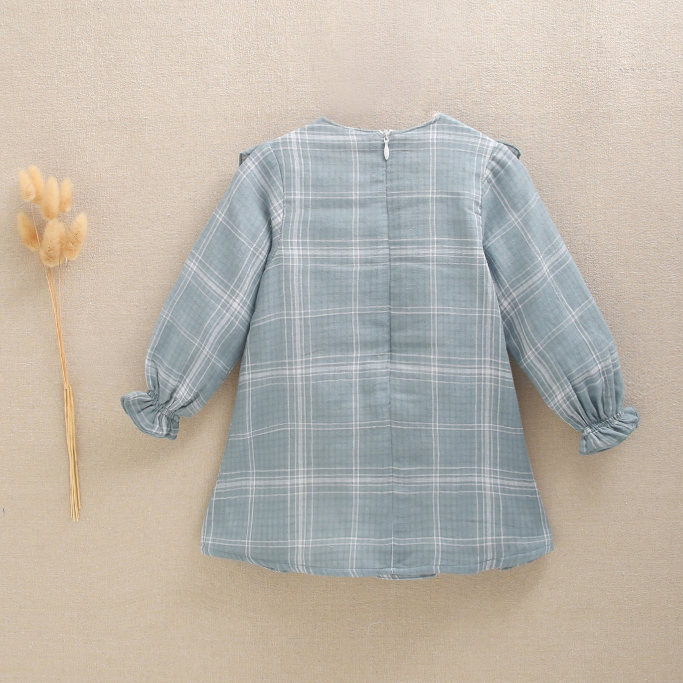 Vestido bebé niña en color verde petróleo y cuadros blancos. Volantes delanteros en pechera y bordados de flores en blanco, manga larga con resorte en puño. Forro interno y cierre en espalda mediante cremallera.