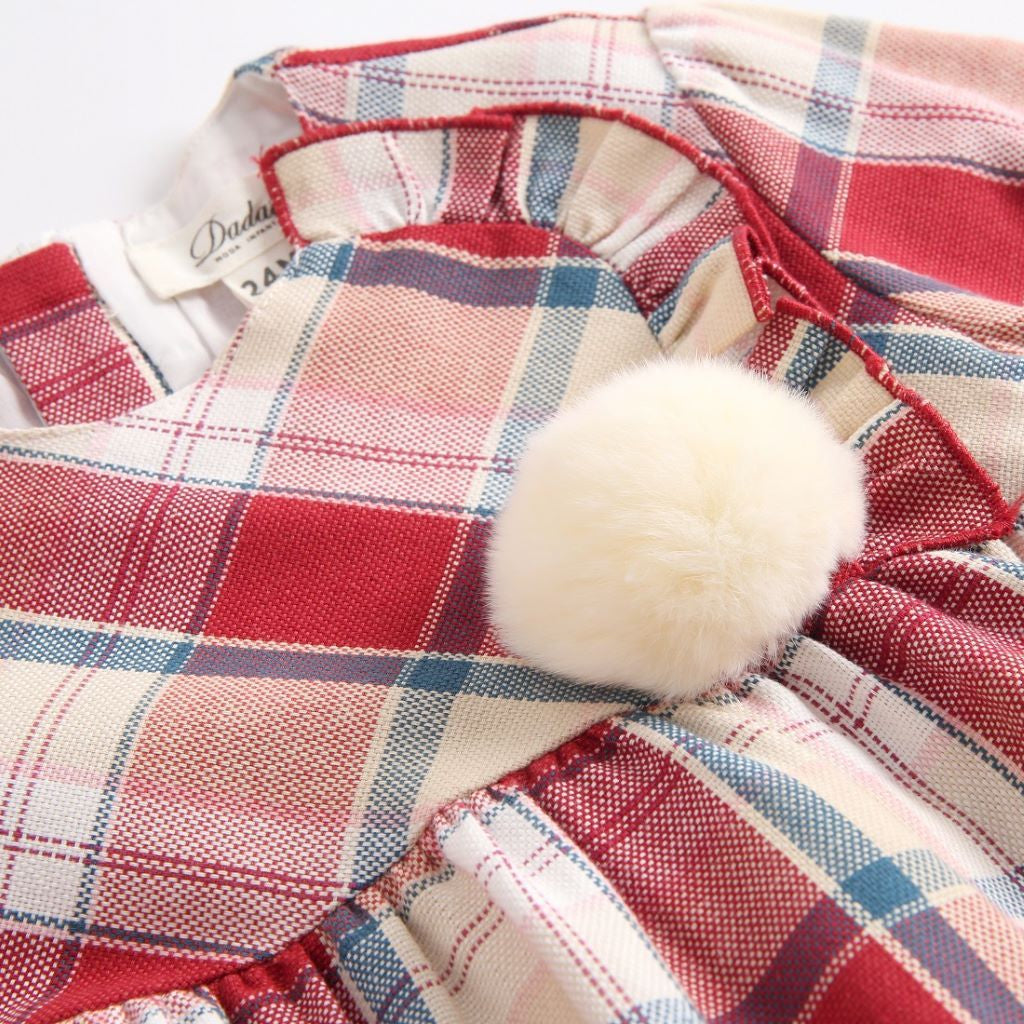 Vestido bebé estampado cuadros grandes rojos, pompón de conejo decorativo, y pequeño olán en la parte de la pechera, cierre mediante cremallera invisible en espalda. Forro interior.