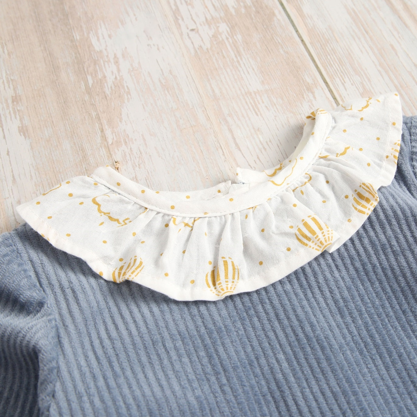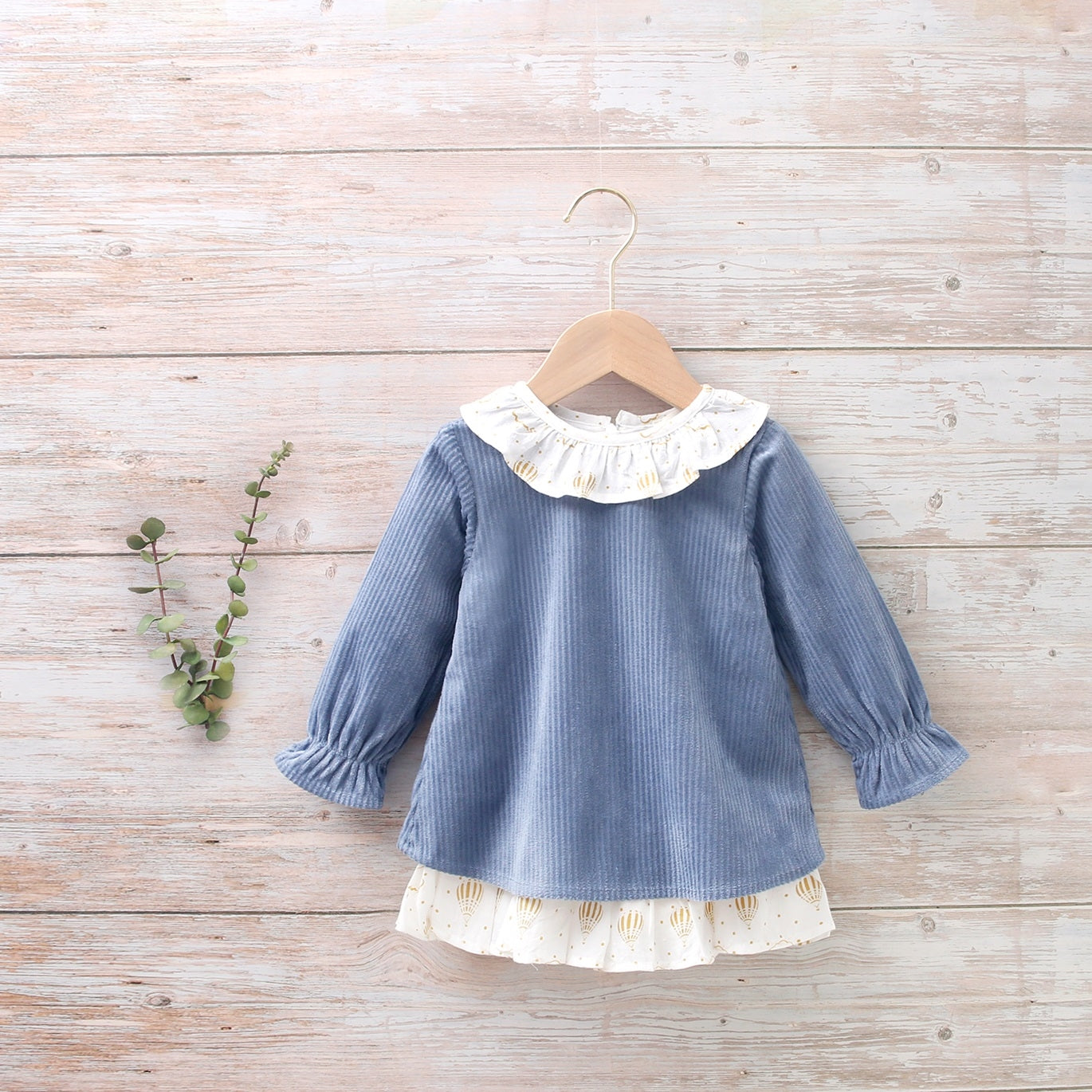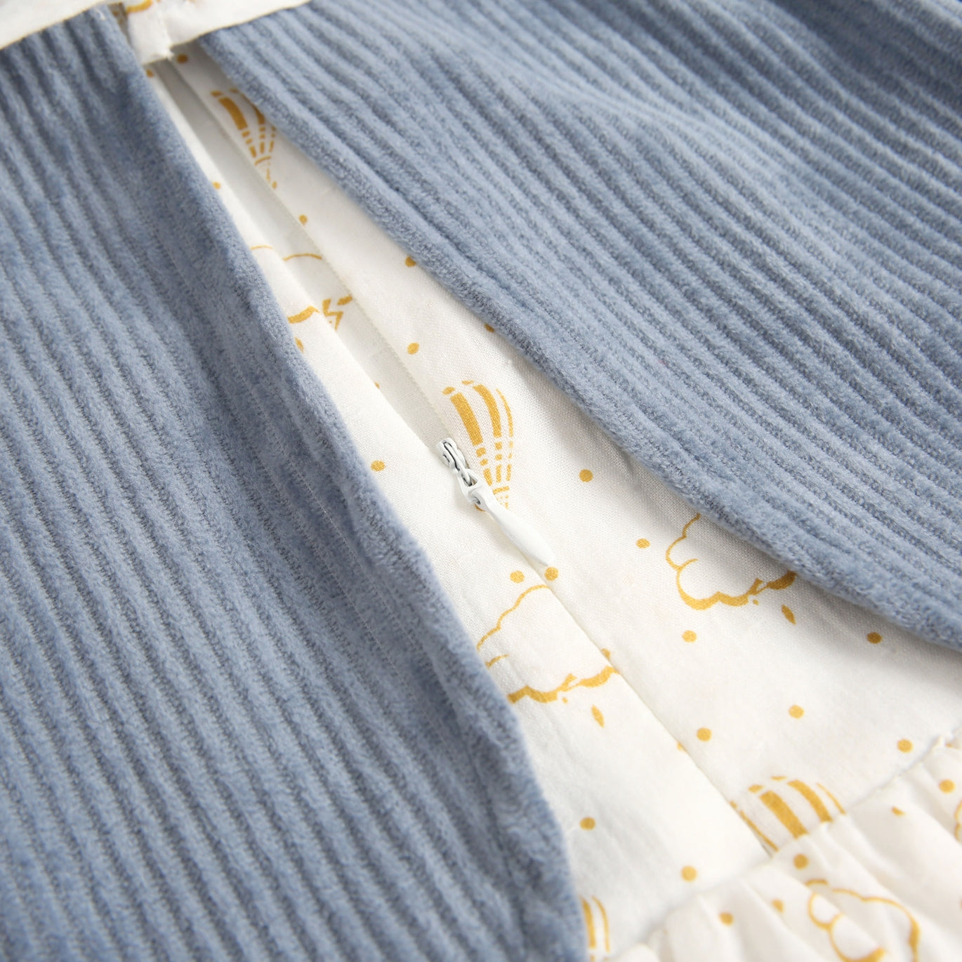Vestido bebé niña pana azul con manga larga y resorte. Estampado de globos en cuello volante y bajo del vestido con olanes. Mismo estampado en la parte de atrás. Cierre en espalda mediante cremallera invisible.
