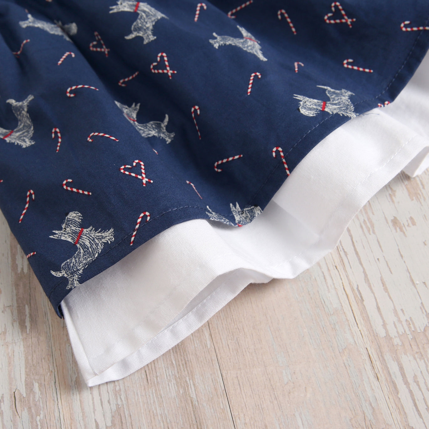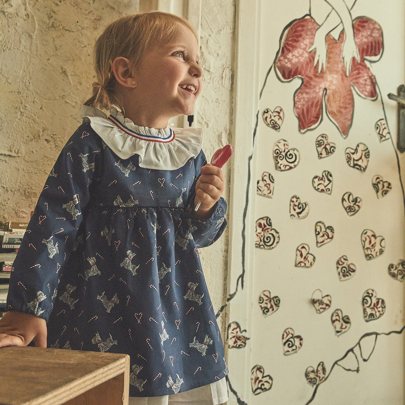 Vestido bebé azul con estampado perritos y caramelos. Cuello con volante y bajo con volante en vestido en color blanco, manga larga con resorte. Cierre en espalda mediante cremallera invisible.