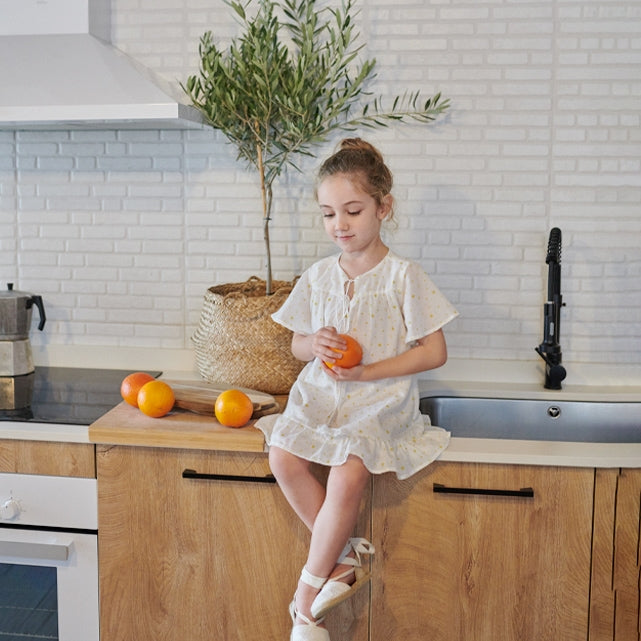 Vestido niña blanco estampado estrellas amarillas. Mangas mariposas, bajo con volante y cierre mediante cordón. Falda evasé