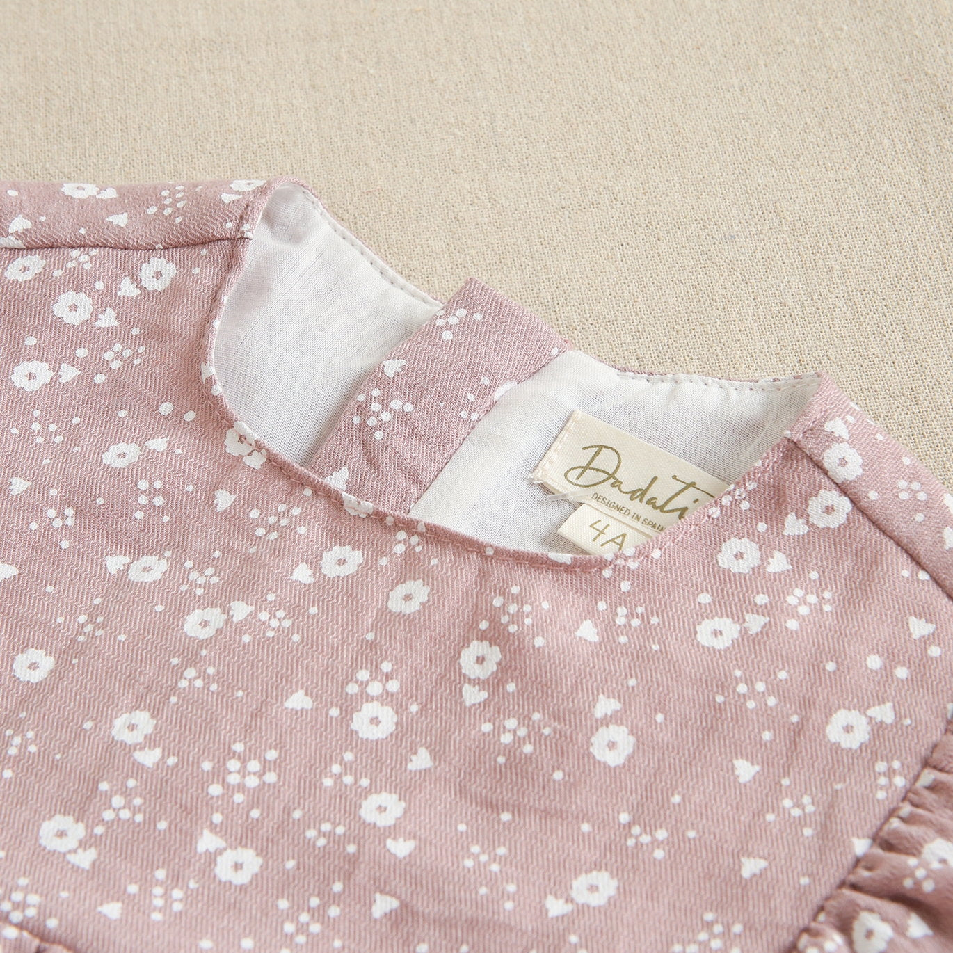 Vestido Jr manga larga con estampado rosa y flores blancas. Corte evasé fluido y con vuelo, detalle volantes en hombros delanteros. Cierre en espalda mediante cremallera invisible.