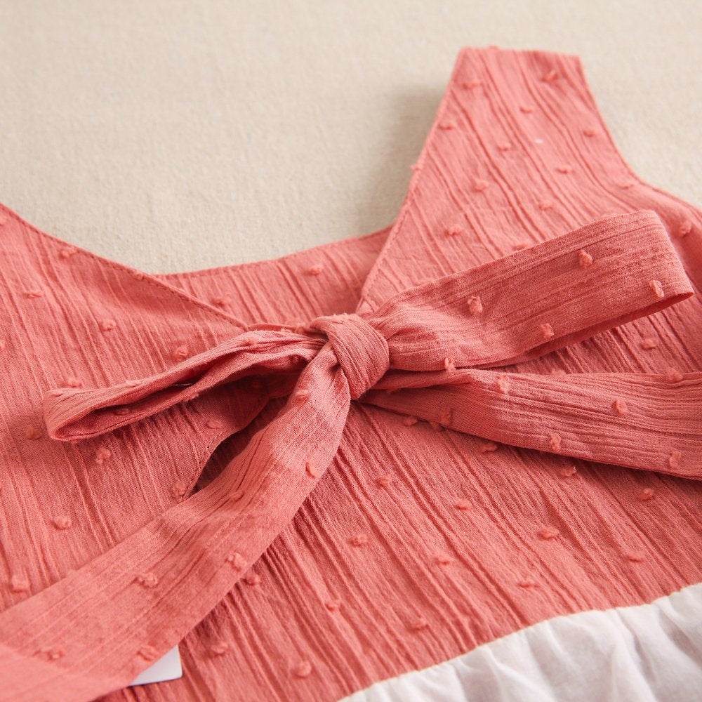 Vestido niña plumeti color coral, manga de tirante y abertura en espalda anudada. Forro interno blanco