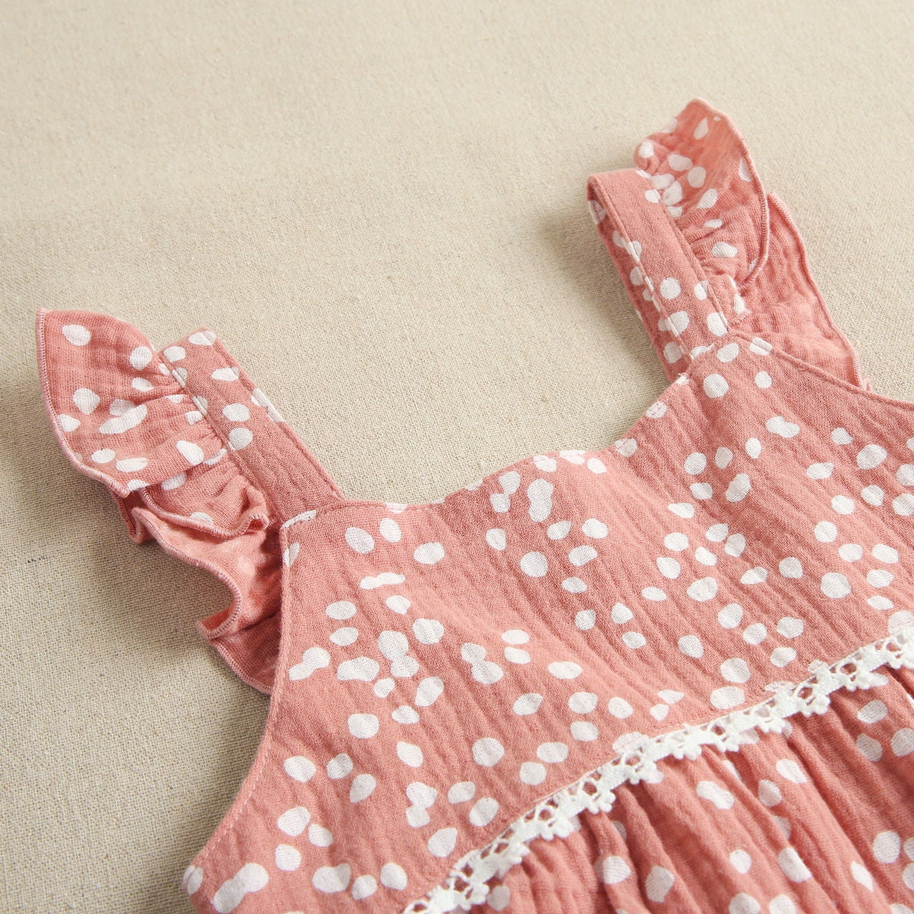 Vestido niña rosa en bámbula con estampado en lunares blancos, cinta decorativa en puntilla blanca, volantes en tirantes y falda en evasé. Resorte debajo de la pechera.