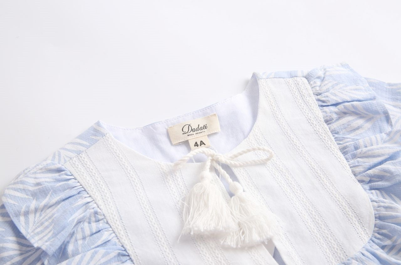 Vestido para niña azul, estampado hojas blancas, pechera en blanco con atado con borlitas. Manga corta acabado con volante y cierre en espalda mediante cremallera.