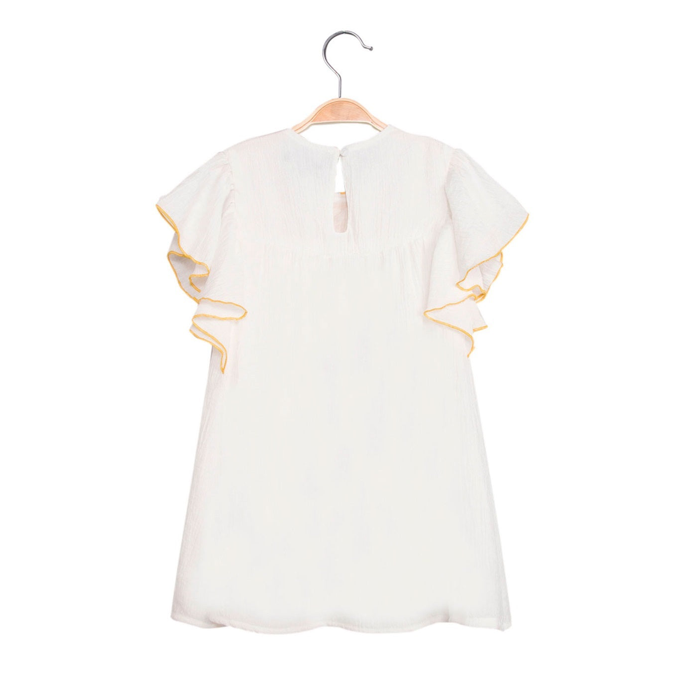 Vestido para niña blanco con estampado hojas mostza en pechera y ribete en mismo color en volantes/magas. Cierre en espalda mediante botón.