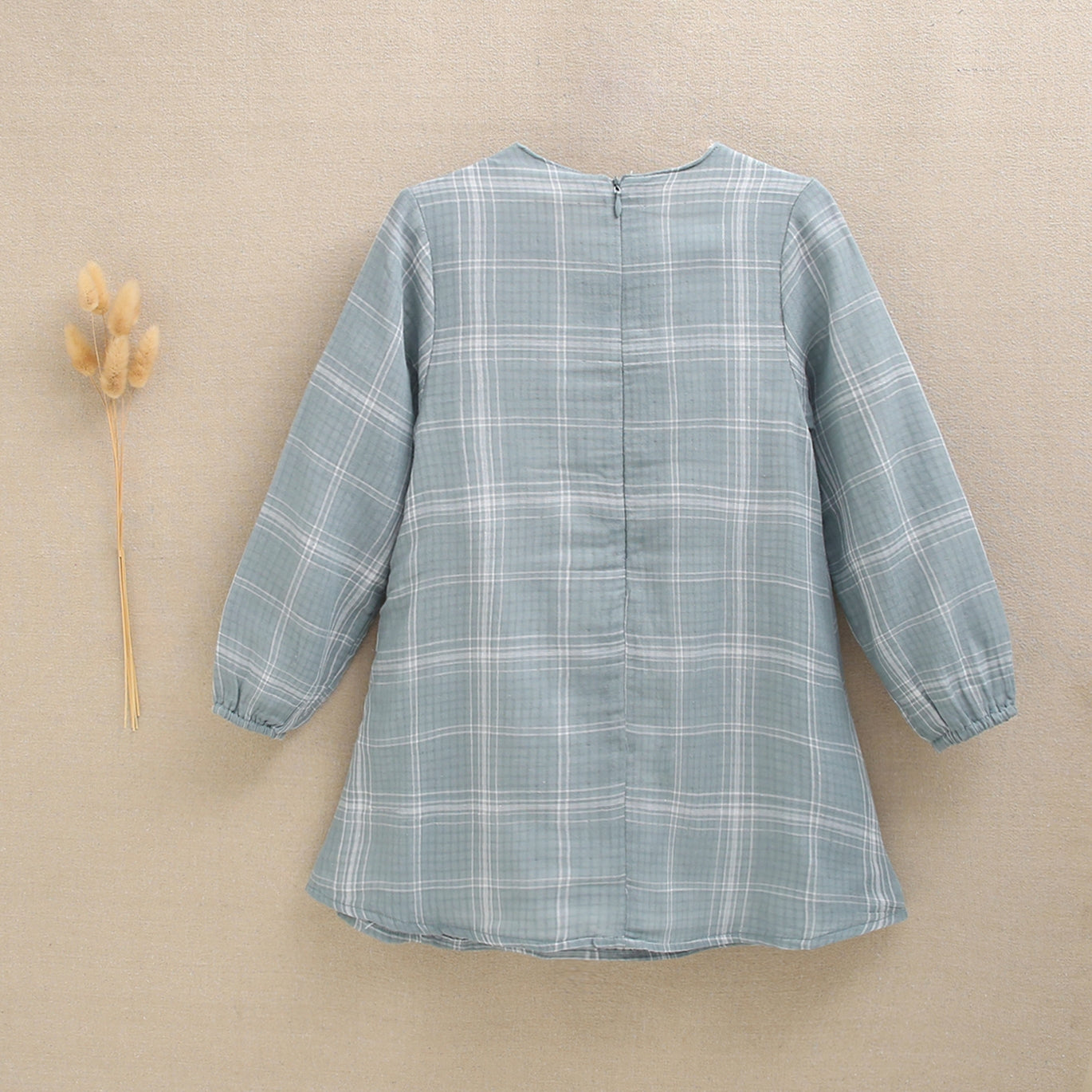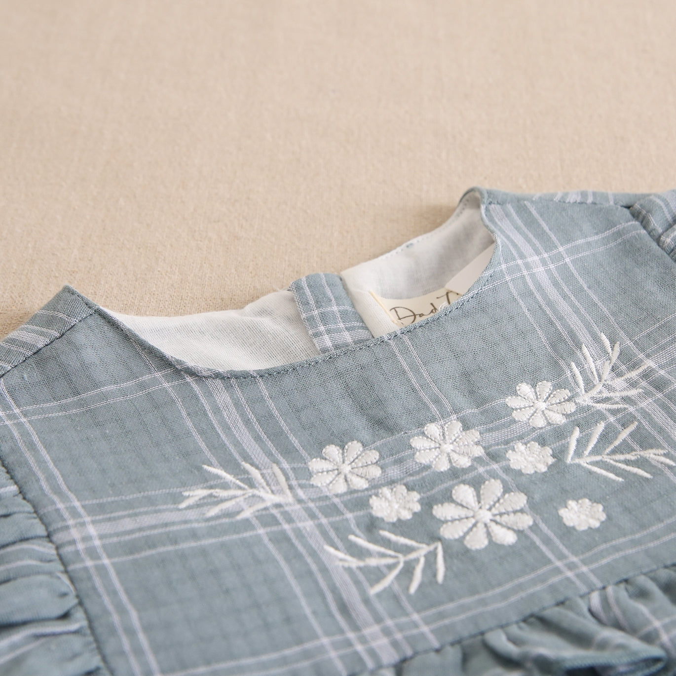 Vestid niña en color verde petróleo y cuadros blancos. Volantes delanteros en pechera y bordados de flores en blanco, manga larga con resorte en muñeca. Cierre en espalda mediante cremallera y forro interno.