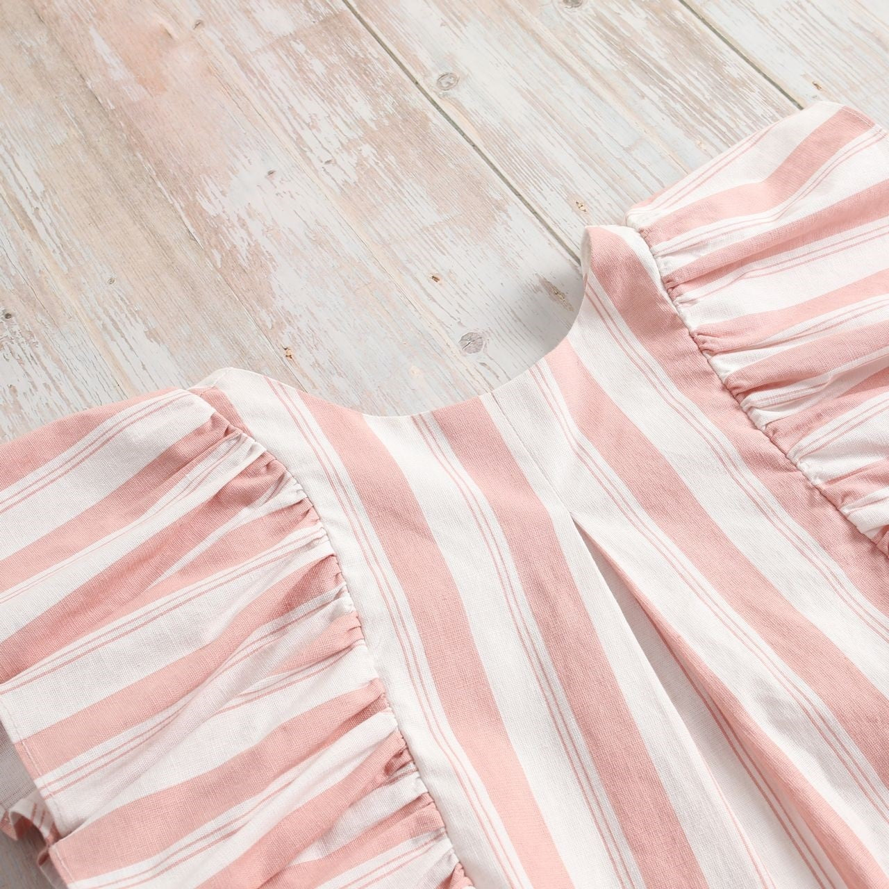 Vestido niña rayas rosas y blancas, con manga de murciélago, pinza en la parte delantera. Y escote en pico con tirantes cruzados en espalda.