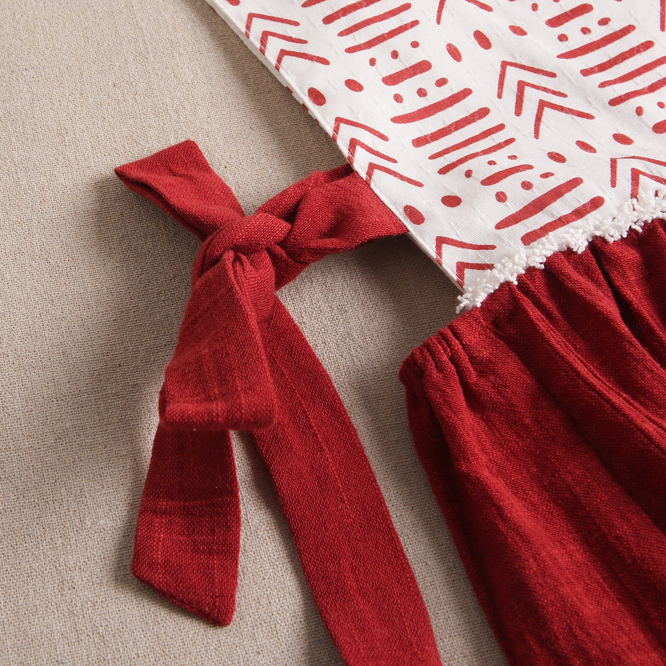 Vestido Jr estampado étnico en pechera, abertura lateral con lazada y falda tono rojo.