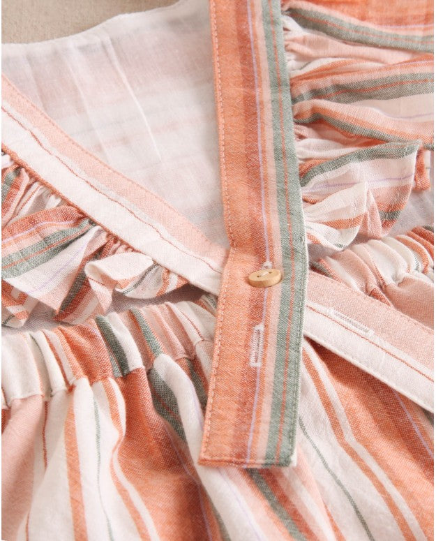 Vestido niña mix rayas naranjas, verde y blancas, tirantes cruzados en espalda. Volantes en tirantes.